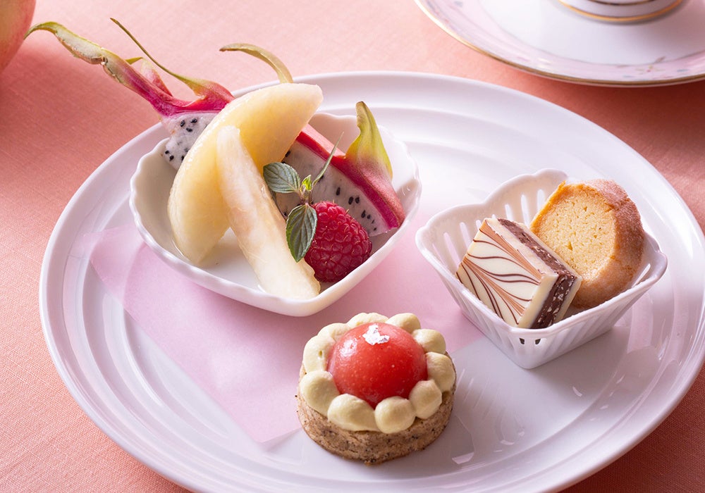 また、3段目には、ヨーグルトに桃とトマトのジュレを組み合わせた「冷製スープ」のほか、「シーフードと夏野菜のタブレ」や「スパイシーミートと枝豆のキッシュ」、「手毬スモークサーモン」など、充実の夏らしいセイボリーも、ご一緒にお楽しみいただけます。