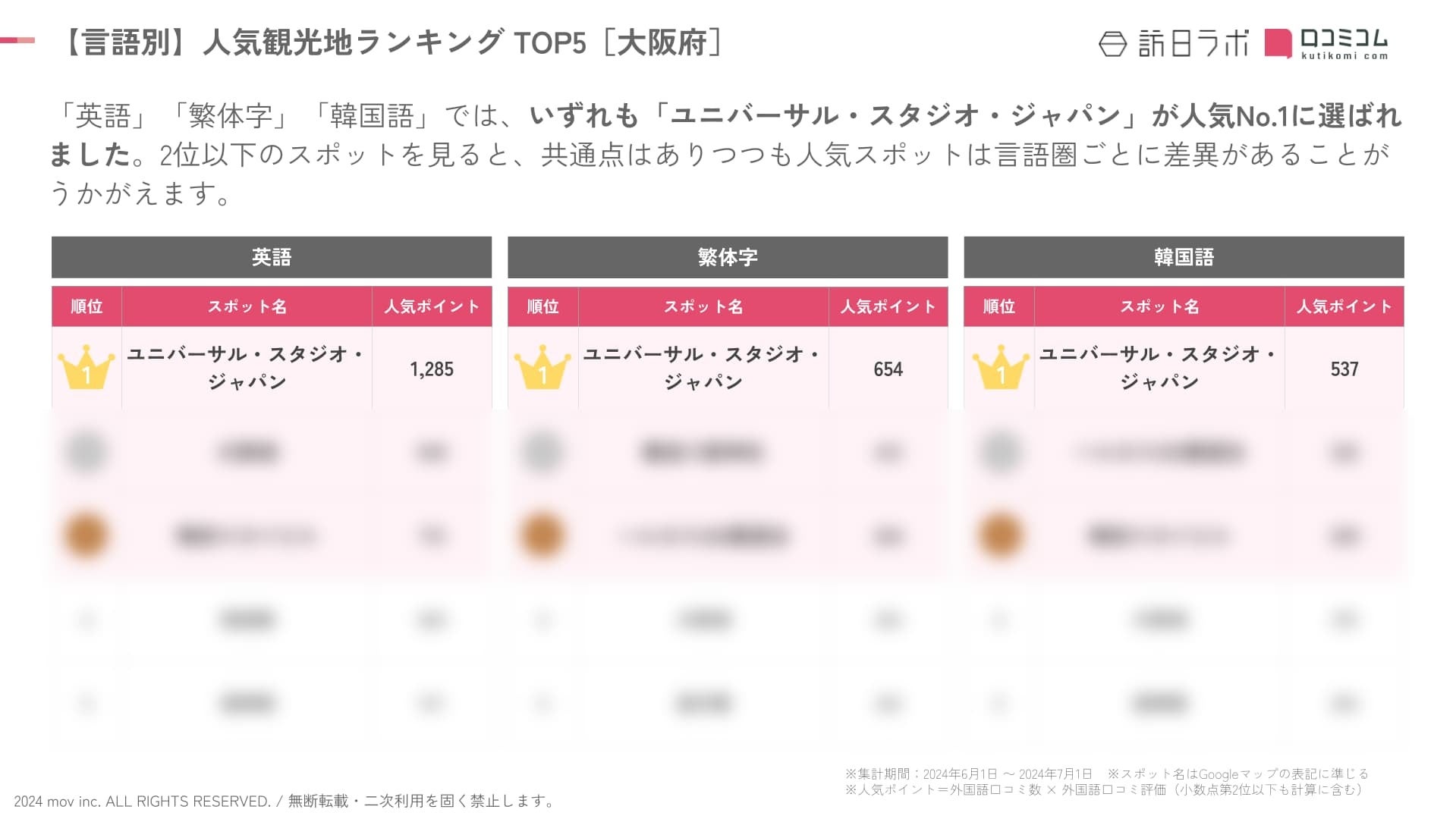 2位以下のスポットを見ると、共通点はありつつも人気スポットは言語圏ごとに特徴があることがうかがえます。