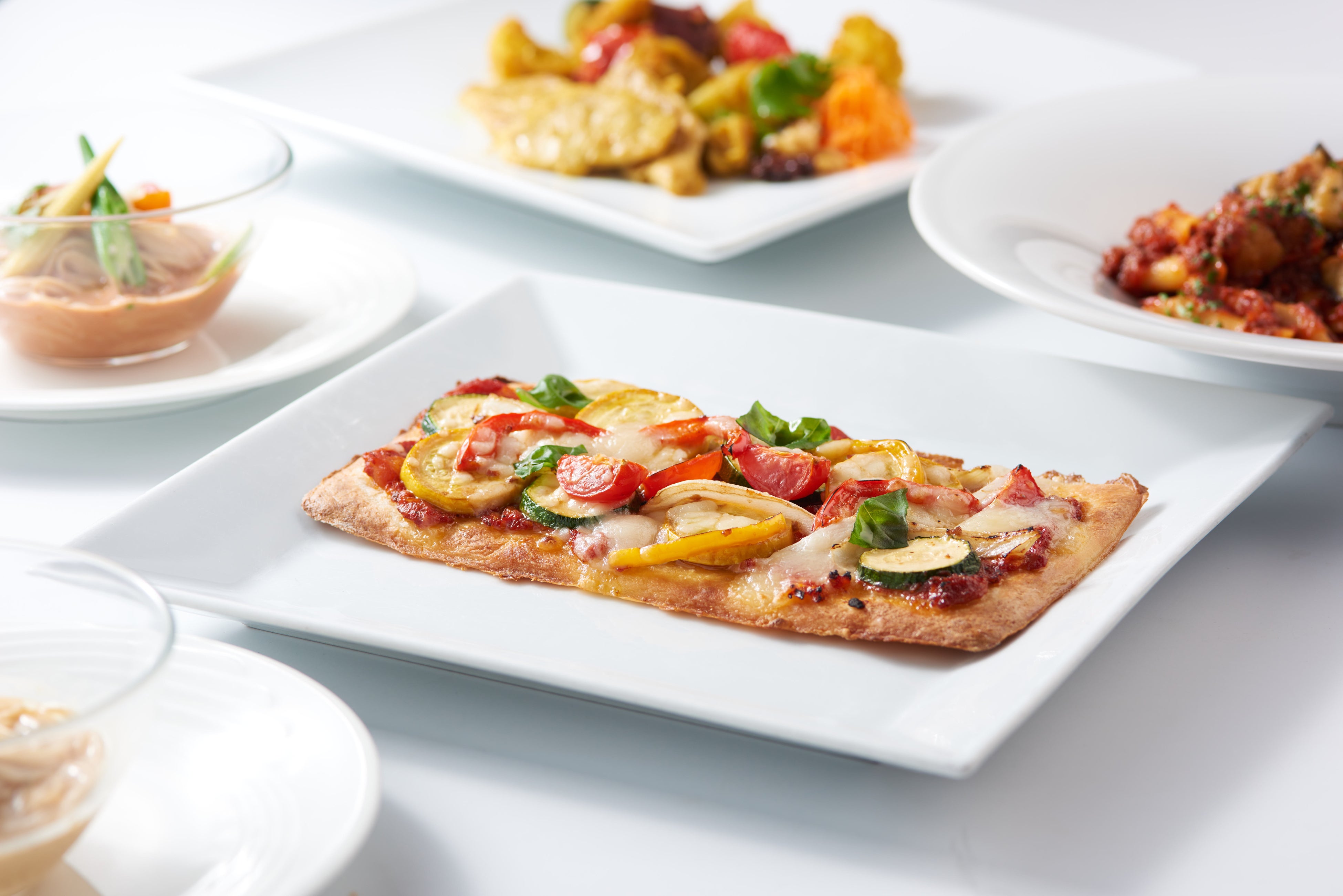 この度、多様化するライフスタイルや訪日外国人の需要拡大を受け、改めて、メニューの見直しを図り、ホテル内の栄養士監修のもと、本格的なヴィ―ガンメニューをさらに拡充。メニュー表記についても、「VG」(ヴィ―ガン)、「GF」(グルテンフリー)の表示を追加しました。2024年夏のメニューでは、夏野菜を使用したピッツァやココナッツカレー、つるんっと食べたい冷麺まで、幅広いラインアップが登場いたします。