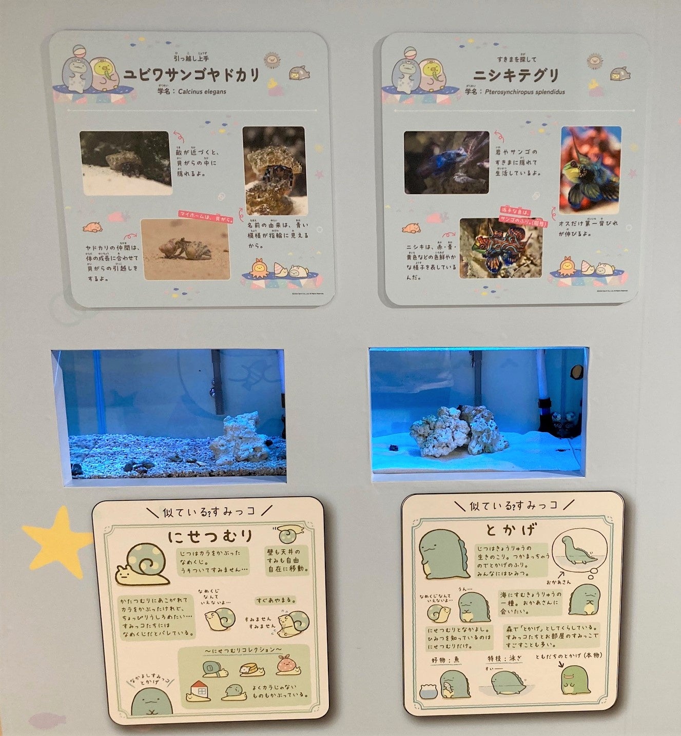 メイン会場となる催事ホールでは、「すみっコぐらし」のキャラクターのように個性的な海の生きものを12種展示し、キャラクターがデザインされたオリジナル解説パネルと共にじっくり観察できます。