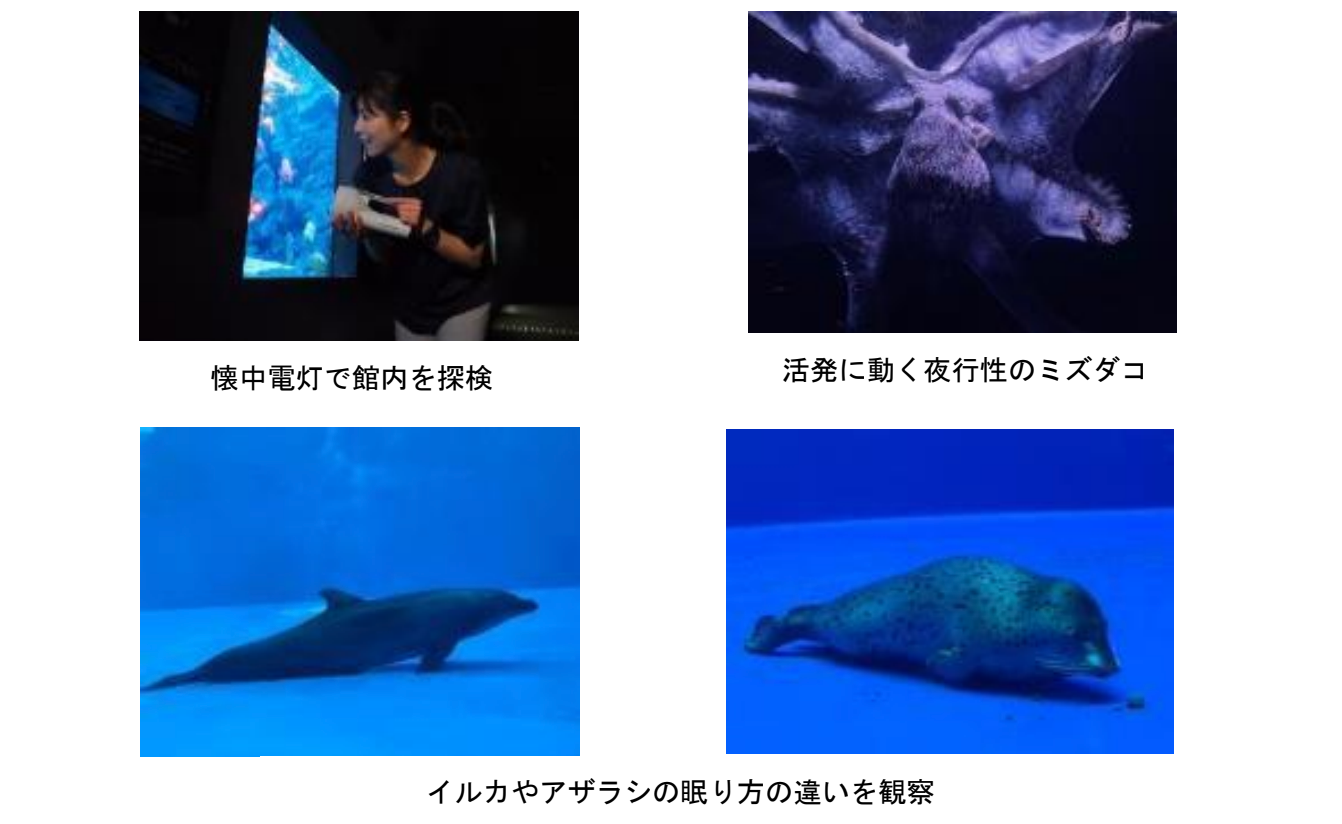 水槽や館内の照明を落とし、暗闇に包まれた「夜の水族館」を、隅々まで探検することができます。赤色のフィルムを巻いたライトを片手に、活発に動き回る夜行性のミズダコや、 ウトウトしているバンドウイルカなど、「夜ならではの生きもの姿」を観察できます。 どんな発見ができるかは自分次第!