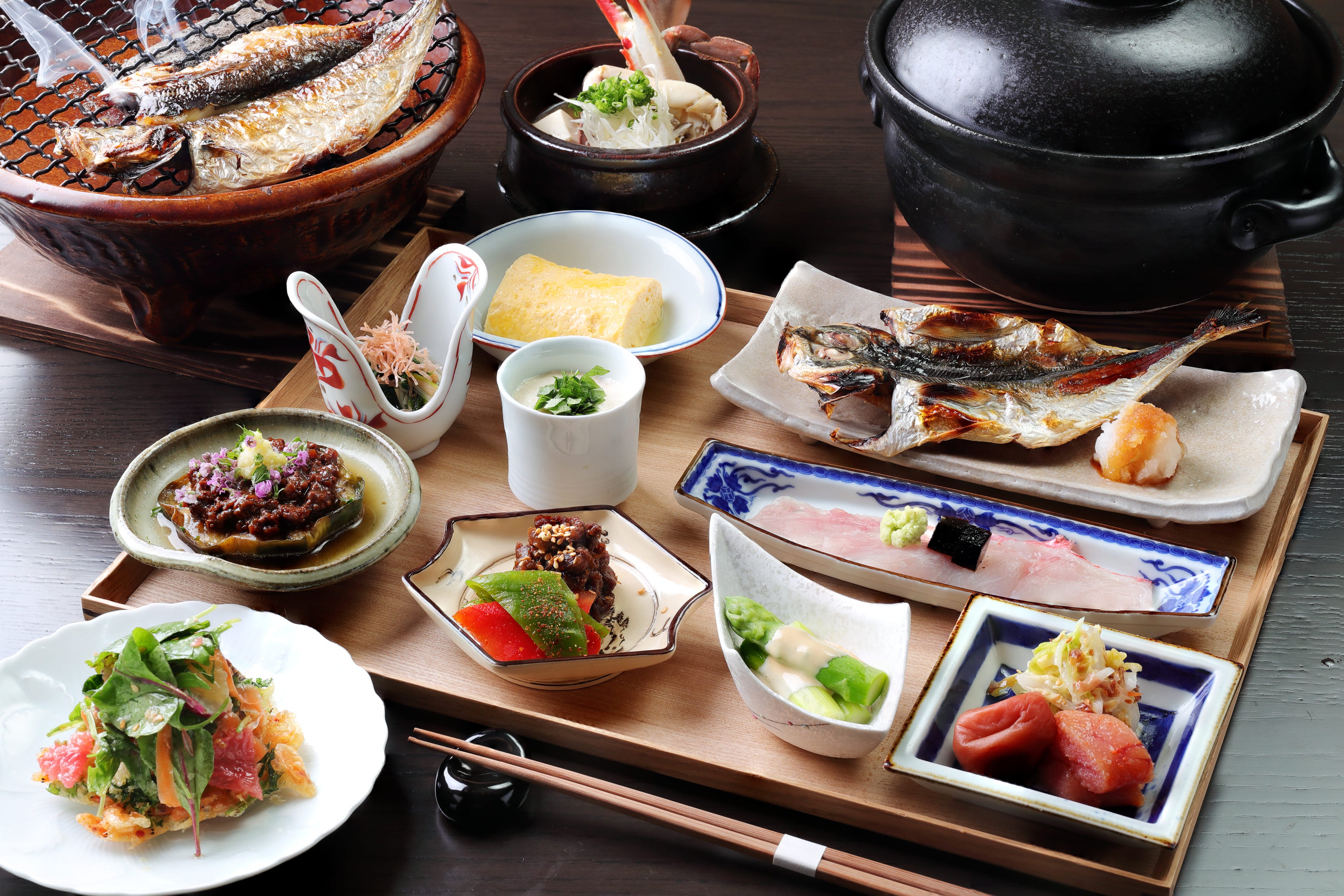 ご朝食は、地産野菜のサラダから始まり、ふわふわのだし巻き卵、ほくほくの釜炊きご飯、新鮮なお造りなどをご用意しております。アジの干物は、七輪を使ってお客様ご自身で仕上げを愉しんでいただきます。魚本来の風味が一層引き立ち、表面はカリッと、中はしっとりとした絶妙な食感が味わえます。静岡県の魅力的な食材を十分に引き立てた豊かな味わいのご朝食は、旅の記憶と共に思い出す至福のひとときとなることでしょう。