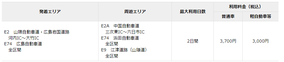 本ドライブパスは、島根県石見地方のNEXCO西日本の高速道路が2日間定額で乗り放題となるお得な割引商品です。