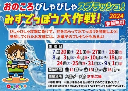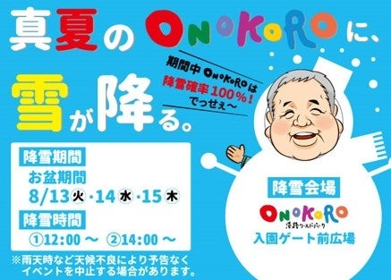 淡路島東海岸に位置する複合娯楽施設「淡路ワールドパークONOKORO」では、夏休み期間の来園者に暑さを吹き飛ばしてもらおうと、「水」と「氷」を使ったイベントを用意しています。「水」イベントは『おのころびしゃびしゃスプラッシュ みずてっぽう大作戦』と題し、みずてっぽうを撃ち合うイベントと、「氷」イベント『真夏のONOKOROに雪が降る』では、降雪機を使用して園内に雪を降らせます。2024年7月20日(土)~2024年9月1日(日)まで開催いたします。