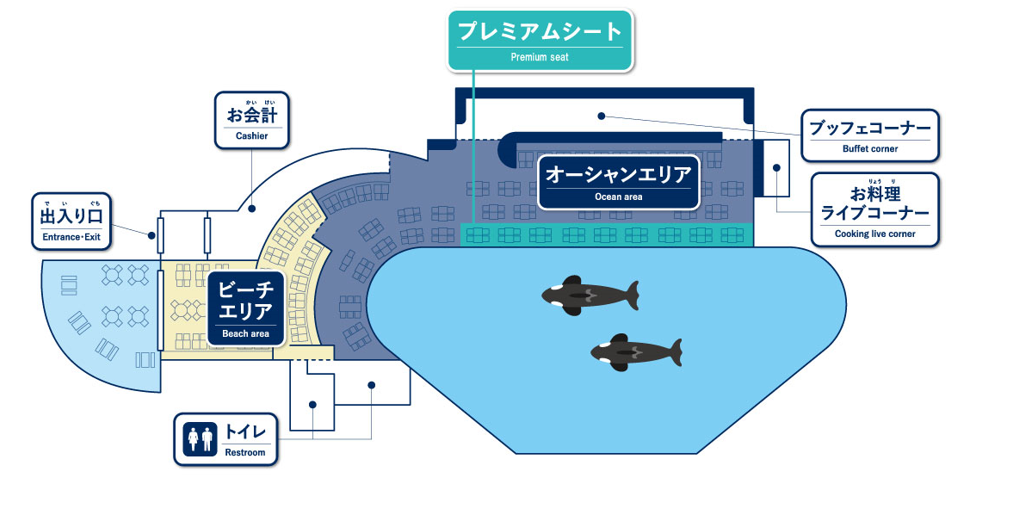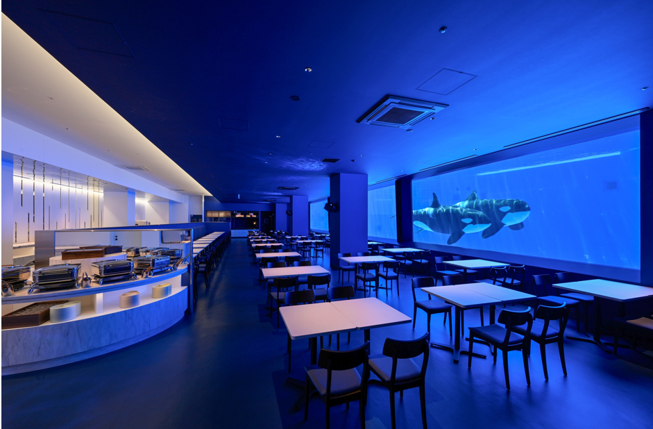 この度、より便利にレストランをご利用いただくために、事前予約を導入いたしました。水槽のアクリル越しに、シャチを間近で観察をしたり、水槽から少し離れたところから、シャチのダイナミックさを体感していただくなど、お客様のお気に入りの席で、シェフが腕をふるうお料理をぜひお楽しみください。