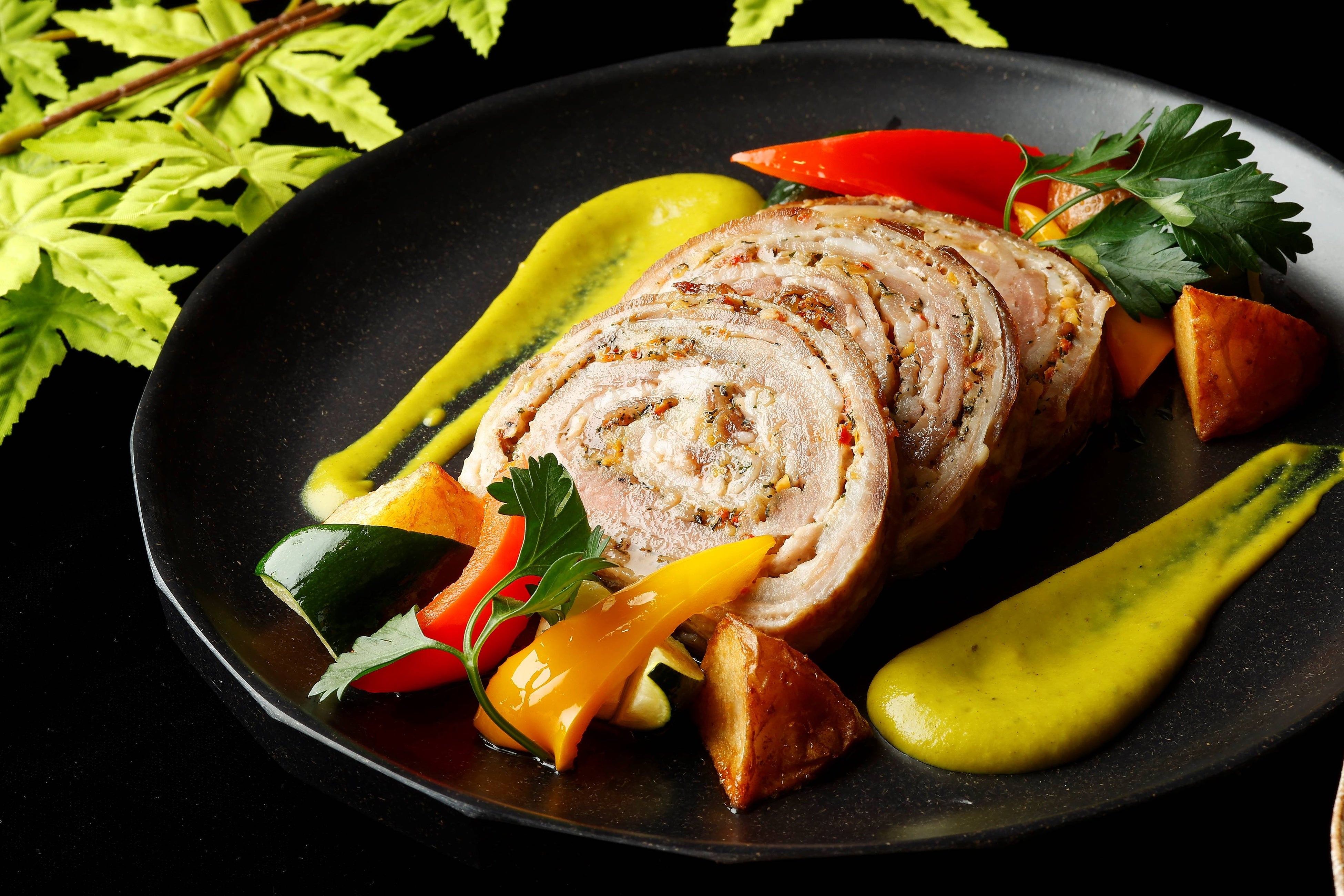 薄切りの豚肉を幾重にも重ね、数種類の香草やチーズとともにくるくると巻き込み焼き上げたシェフこだわりの一品。舌の上でほどける食感とあふれる肉汁の旨味。爽やかな香草の香りとチーズのコクのフュージョンをご堪能ください。マスタード風味のソースと一緒にお召し上がりいただくのがオススメ。