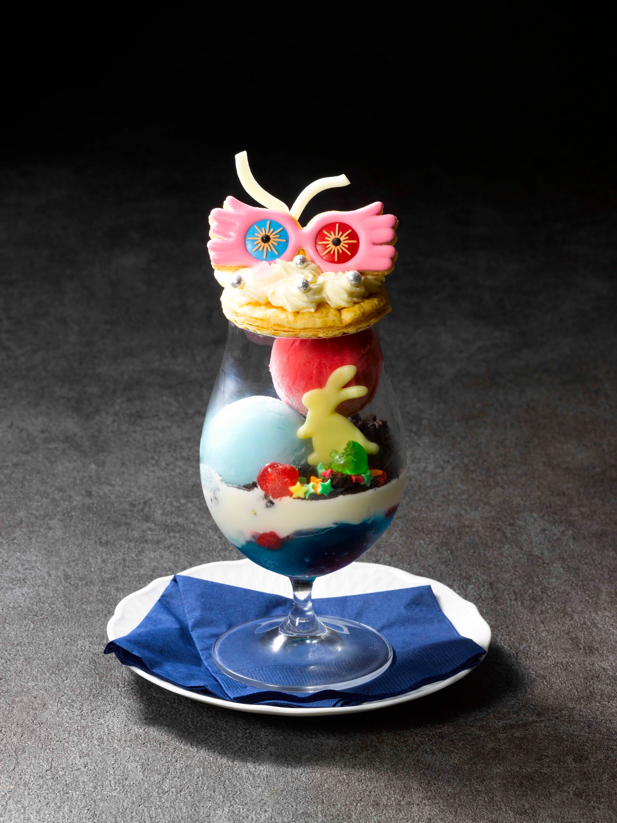 ルーナ・ラブグッドの象徴的なアイテムであるメラメラメガネをクッキーで、守護霊のウサギをチョコレートで再現した、プレミアムパフェシリーズの第二弾。