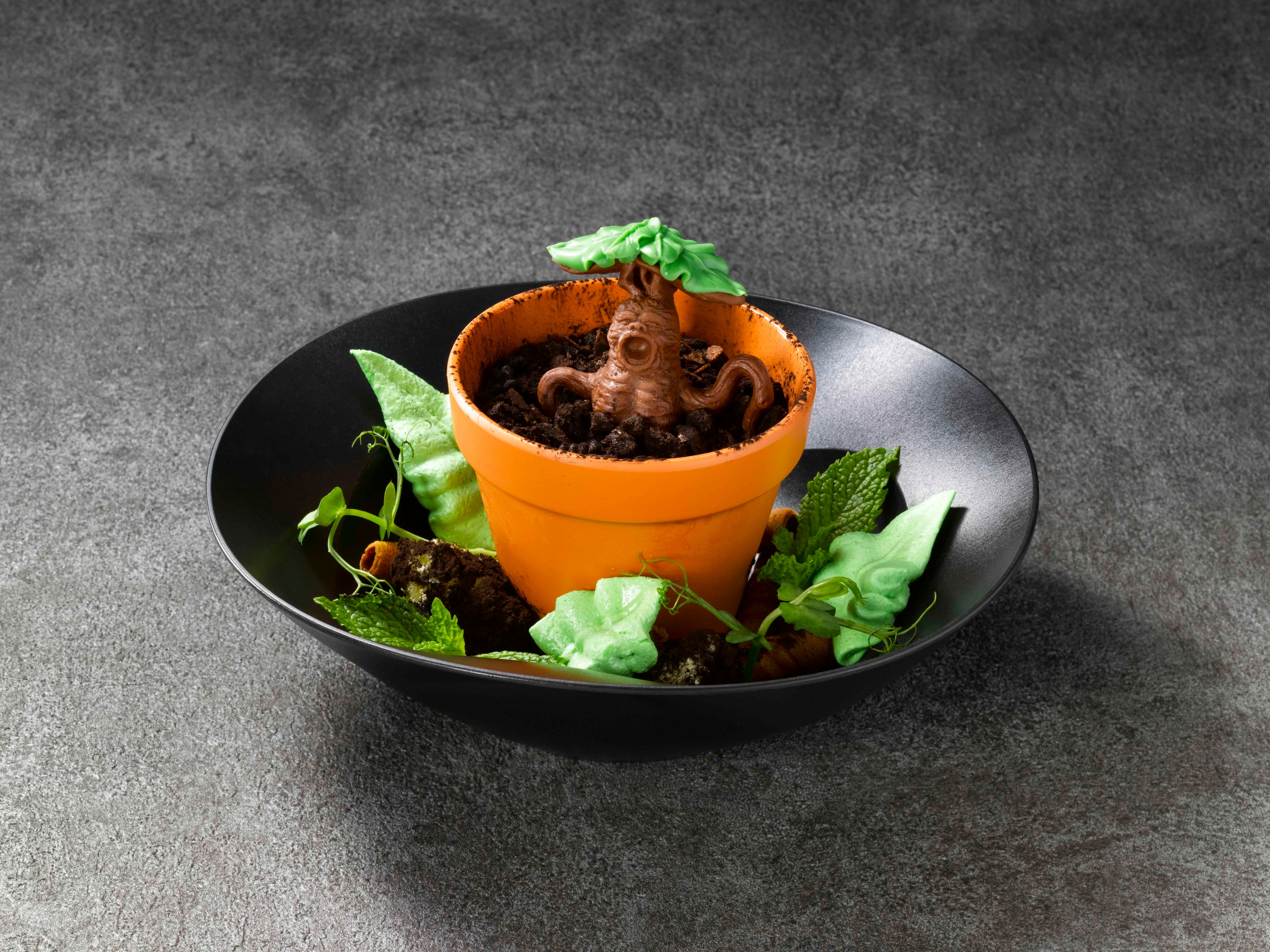 チョコレートのトライフルを植木鉢風の容器に入れ、こちらもチョコレートで出来たマンドレイクをトッピング。