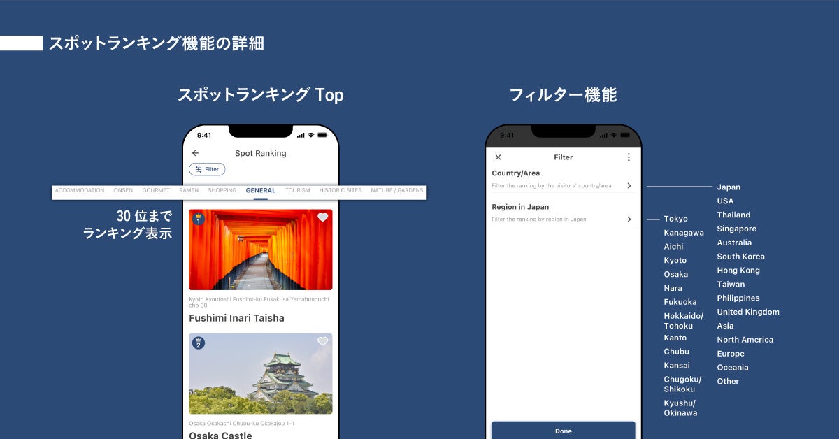 本機能により、自分と同じ国から来ている旅行者の動向や異なる文化のトレンドを見比べたり、日本人のおでかけの傾向を知ることなどに利用できます。ガイドブック・サイトの情報やSNS投稿などで特定の観光地への訪問が偏るケースもありますが、日本全国のさまざまな地域の魅力を知ってもらい、新たなスポットを発見するきっかけとなればと考えています。旅マエのプランニングで、「行きたい県や地方は決まっているが、具体的な目的地が決まっていない」「自分と同じ国の人はどこを観光しているのか知りたい」「地元に人気のローカルなスポットに行きたい」といったニーズに応え、ユーザーが関心に合ったスポットを簡単に見つけられるようサポートします。