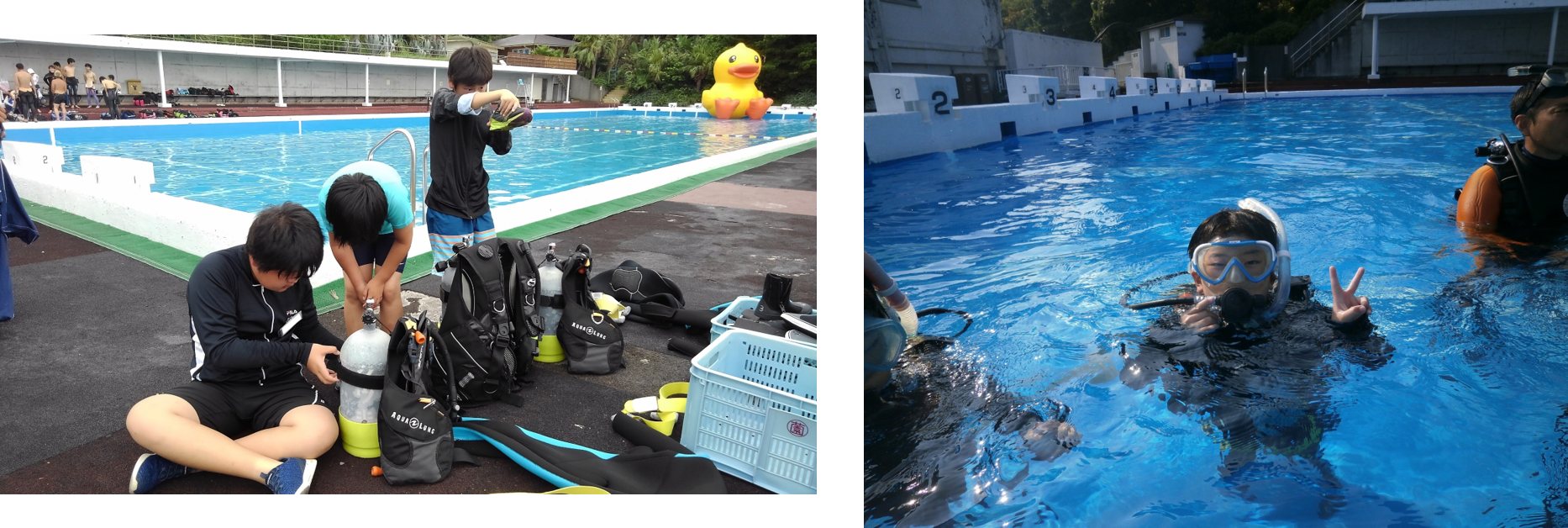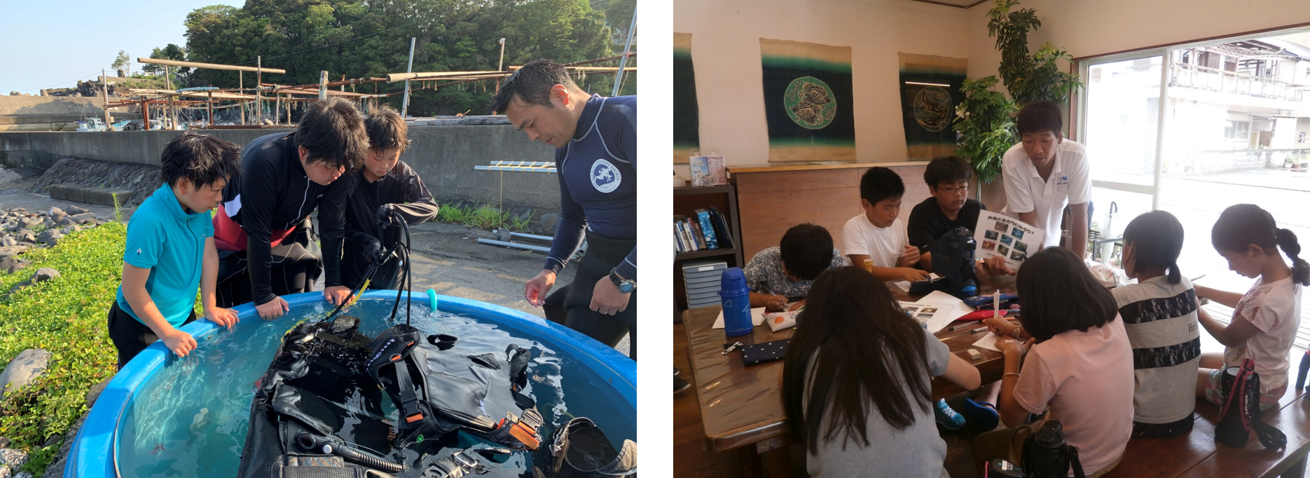 海でダイビングの練習、海の魚を見よう、学科講習、お楽しみ会