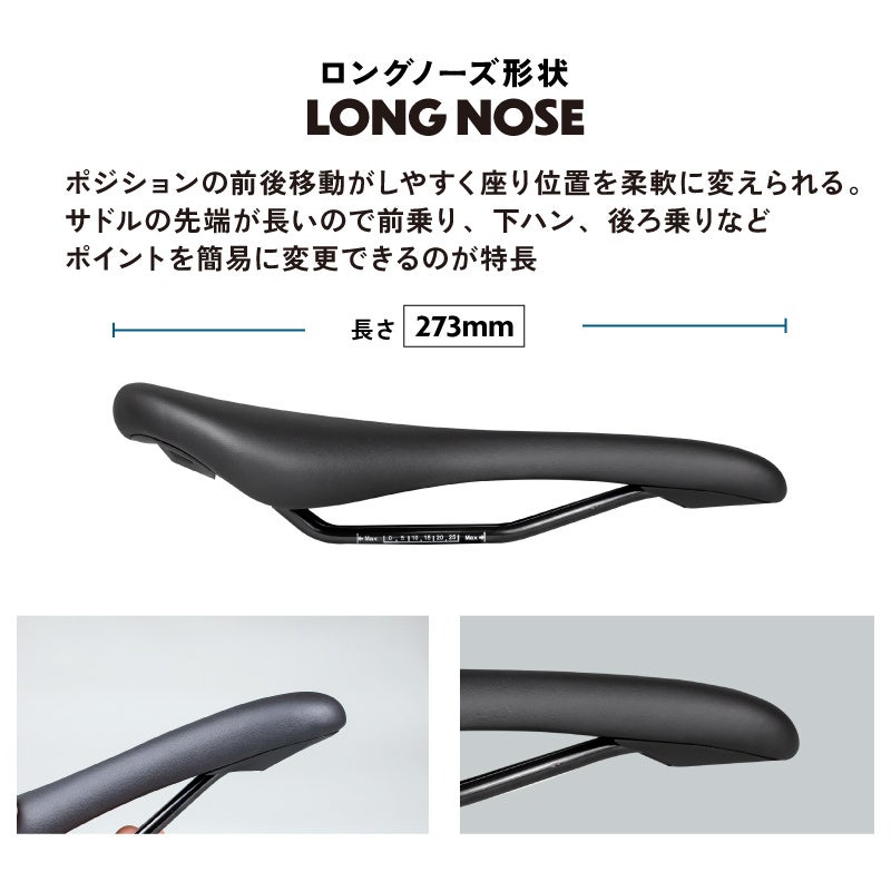 サドルの先端が長いので前乗り、下ハン、後ろ乗りなどポイントを簡易に変更できるのが特長です。