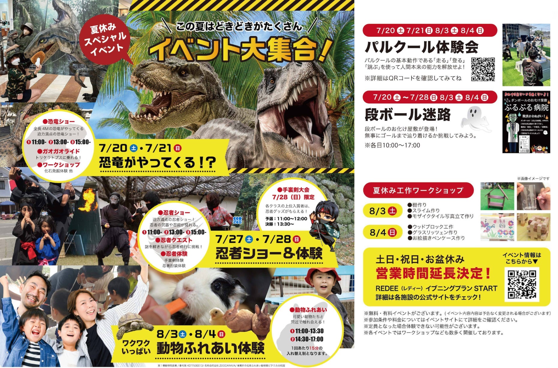 恐竜の化石発掘体験ができるワークショップ、忍者ショー+忍者体験、動物ふれあい体験など、さまざまな体験イベントを開催します。