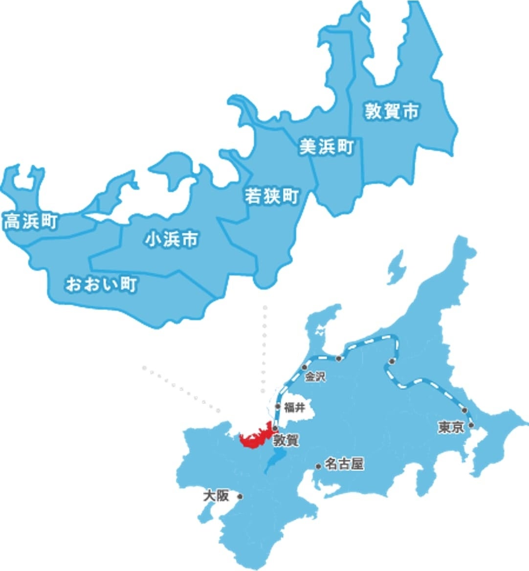 福井県の南西部(敦賀・若狭エリア)は、敦賀市、美浜町、若狭町、小浜市、おおい町、高浜町の6つの市町で構成され、海や山に囲まれた自然豊かな地域です。