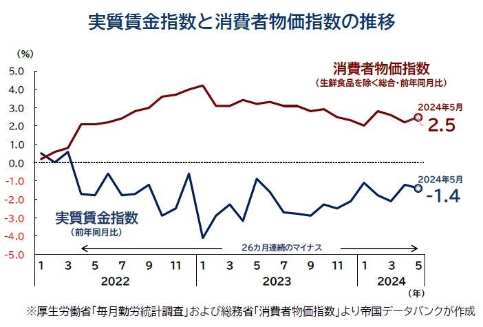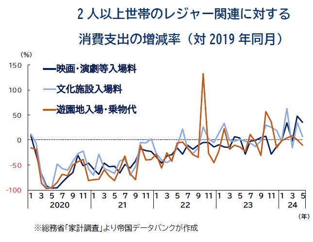 総務省の「家計調査」によると、2人以上世帯のレジャー関連支出(映画・演劇等入場料、文化施設入場料、遊園地入場・乗物代)の増減率は、コロナ前の2019年同月比で改善傾向が続いていた。しかし、2024年に入りペースが鈍化している。実質賃金が26カ月連続で減少している状況下、消費者が娯楽費への支出を減らしている可能性がある。ただし、「映画・演劇等入場料」は、2月の『劇場版ハイキュー!!ゴミ捨て場の決戦』、4月の『名探偵コナン 100万ドルの五稜星(みちしるべ)』など興行収入100億円超え作品の影響で増加した。