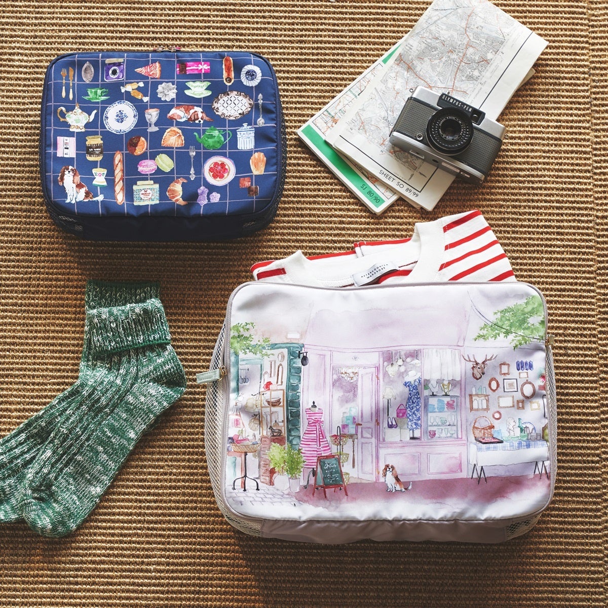 ヨーロッパの街中でカフェを楽しむ女の子や、旅支度をイメージしたアイテムを描いていただきました。