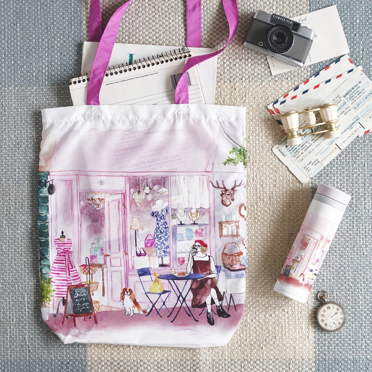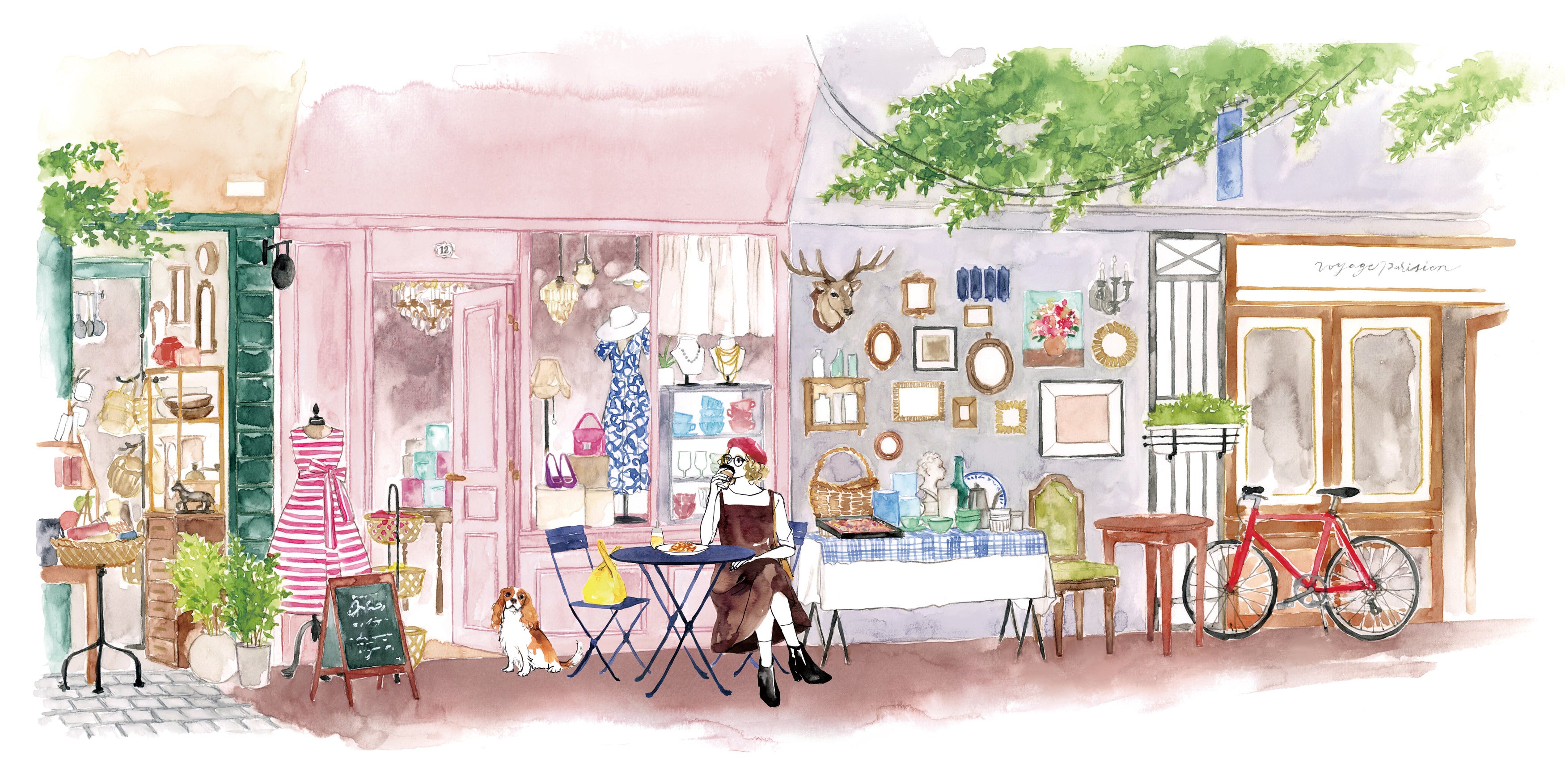 ヨーロッパの街中でカフェを楽しむ女の子や、旅支度をイメージしたアイテムを描いていただきました。