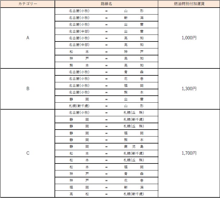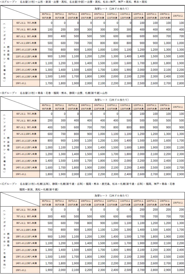 なお、燃油特別付加運賃は、シンガポールケロシン市況価格および為替レートの変動に応じて、1ヶ月毎に見直しております。