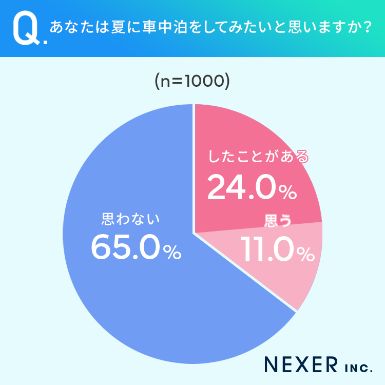 24%の方が「夏の車中泊の経験がある」11%の方が「夏に車中泊をしてみたいと思う」と回答しています。