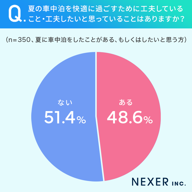 48.6%と半数近くの方が、夏の車中泊を快適に過ごすために工夫していること・工夫したいと思っていることが「ある」と回答しています。