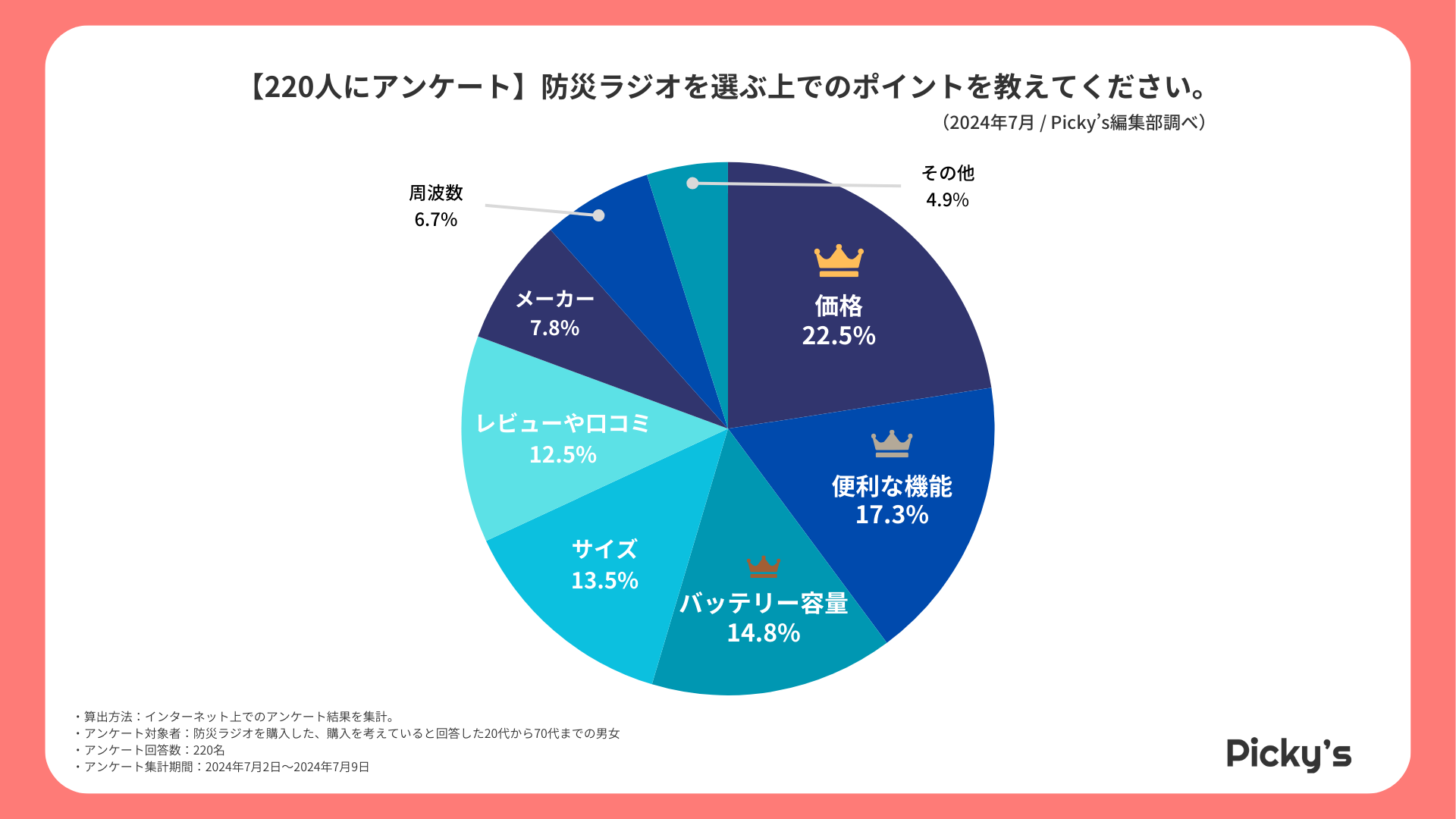 「Picky’s」は、インターネットショッピングにおいて、購入前に試せない・選ぶべきものがわからないという課題の解決を目標に、あらゆる商品のおすすめランキングや検証レビューを紹介するサイトです。このたびPicky’s(https://rentry.jp/)では、アウトドアに先駆けて、防災ラジオについてインターネット上でアンケート調査を行いましたので発表いたします。