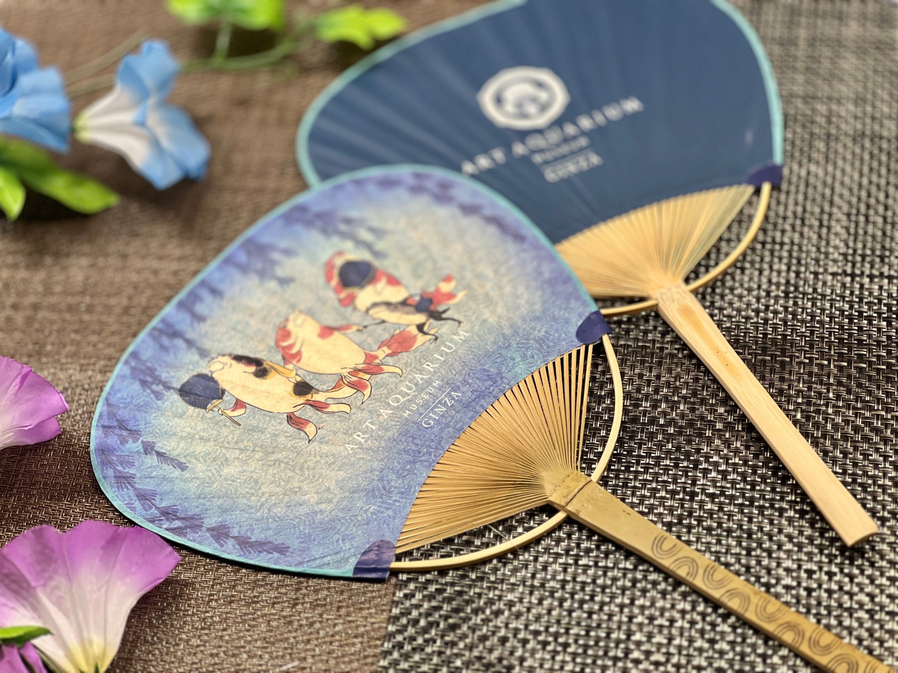 擬人化された金魚たちが歌って歩く姿をデザインしたオリジナルうちわ。江戸時代の人気浮世絵師・歌川国芳が描いた擬人化された金魚たちが可愛らしい人気シリーズ“金魚づくし”の「ぼんぼん」という作品をもとにしたアートアクアリウム美術館オリジナルデザインのうちわです。