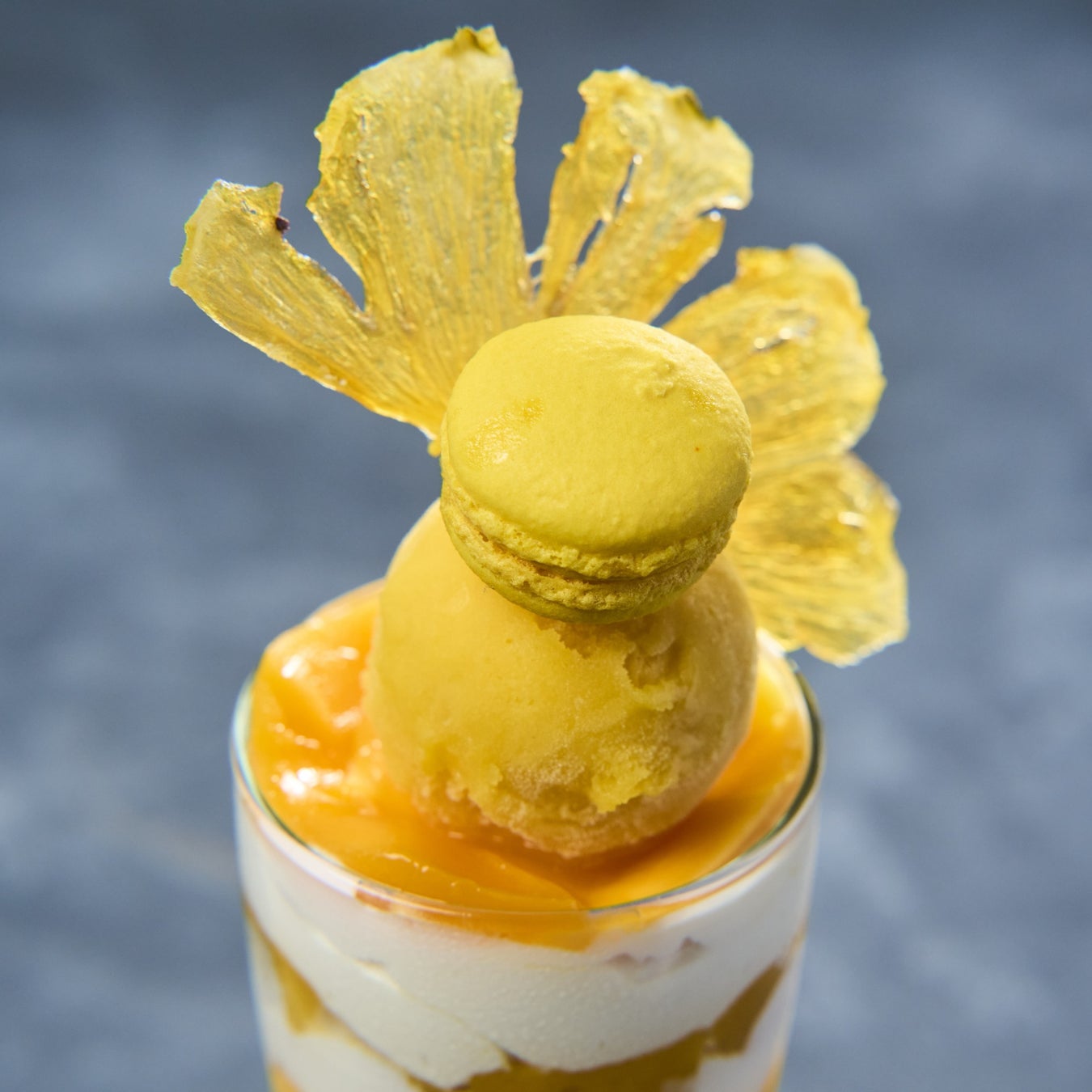 マンゴーの濃厚な甘みと香りがより引き立つように、生クリームではなく、清涼感溢れるヨーグルトムースを重ね、爽やかさをプラスしました。トップには真夏の太陽を想わせる、パイナップルのドライチップスを飾りつけました。独自の製法で薄くスライスしたパイナップルを乾燥させることによって、果実の甘味がより凝縮され、パリッとした食感に仕上げました。旬の果実のジューシーさを余すことなく、涼やかさも兼ね備えたパフェはこれからの季節にぴったり。