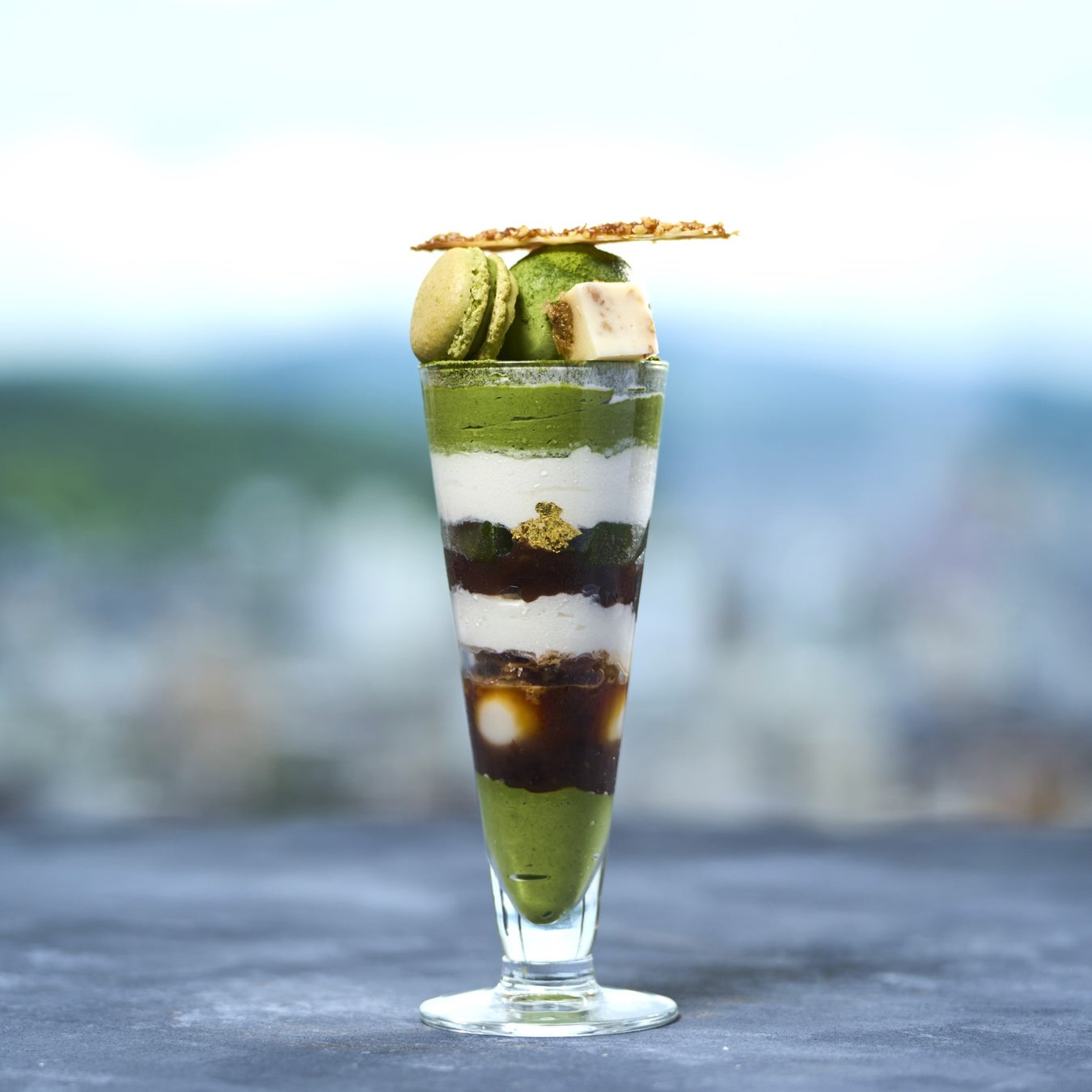 心地よく、そして楽しくお召し上がりいただけるように、もちもちした白玉や抹茶のわらび餅、香ばしいサクサクの生地にしっとりとした抹茶のガナッシュを挟んだマカロンや、ほろ苦さと甘みのコントラストがくせになる春巻きの皮を使った胡桃のキャラメリゼなど、表情豊かな具材を組み合わせ、風味と食感で飽きがこないように計算し尽くしたパフェをご堪能ください。