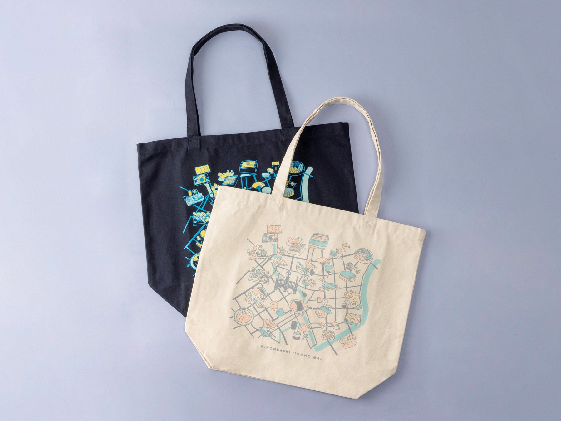 日本橋エリアの地図に、日本橋発祥の味と技をはじめとする “いいもの”をあしらった、コットン素材の大きめトートバッグ。日本橋を観光して、パンフレットやお土産をトートバッグに入れて。街歩きにピッタリなアイテムです。
