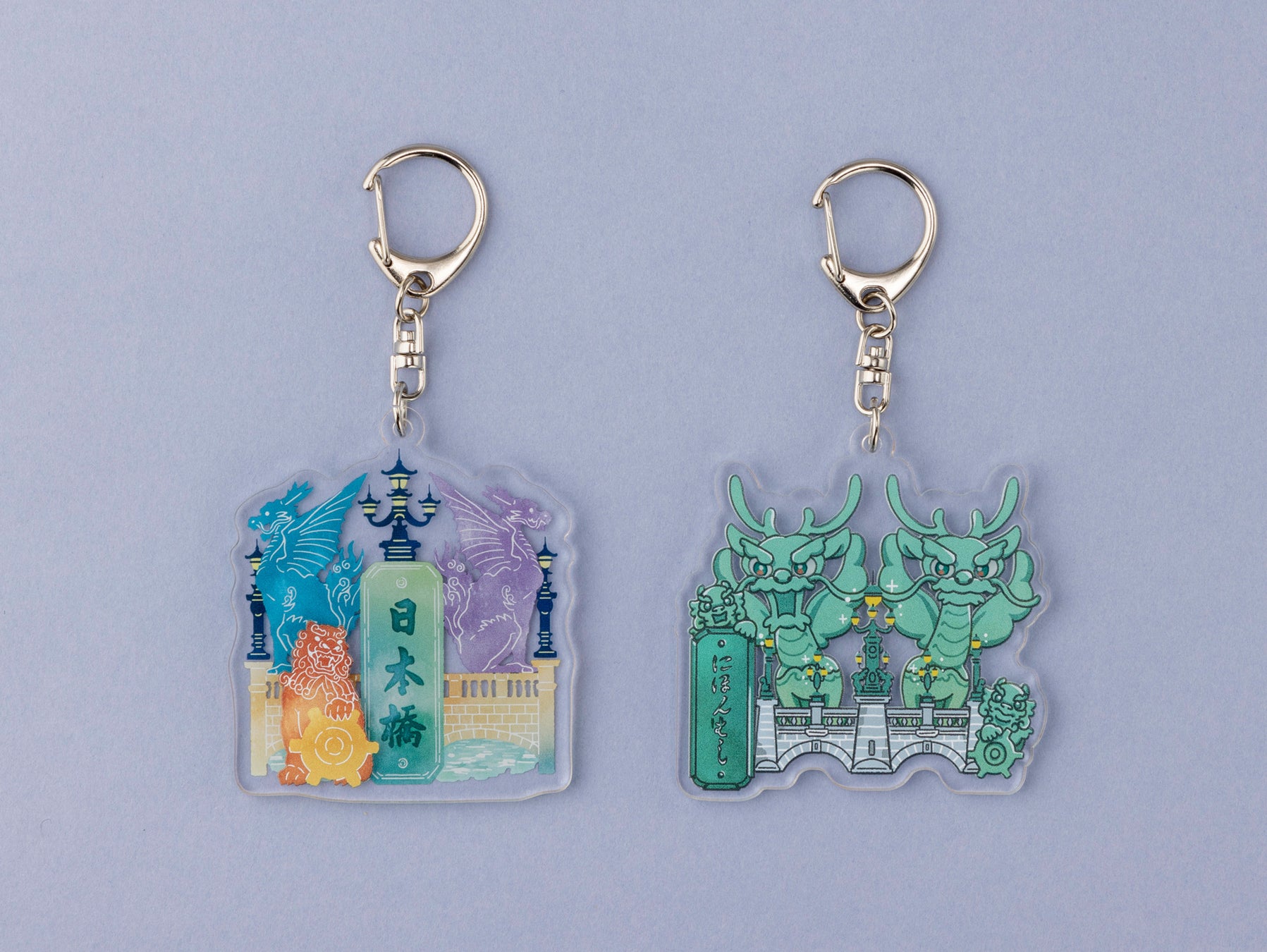 日本橋の象徴である麒麟像と獅子像、そして徳川慶喜によって書かれた文字を、2種のデザインのキーホルダーに仕立てました。