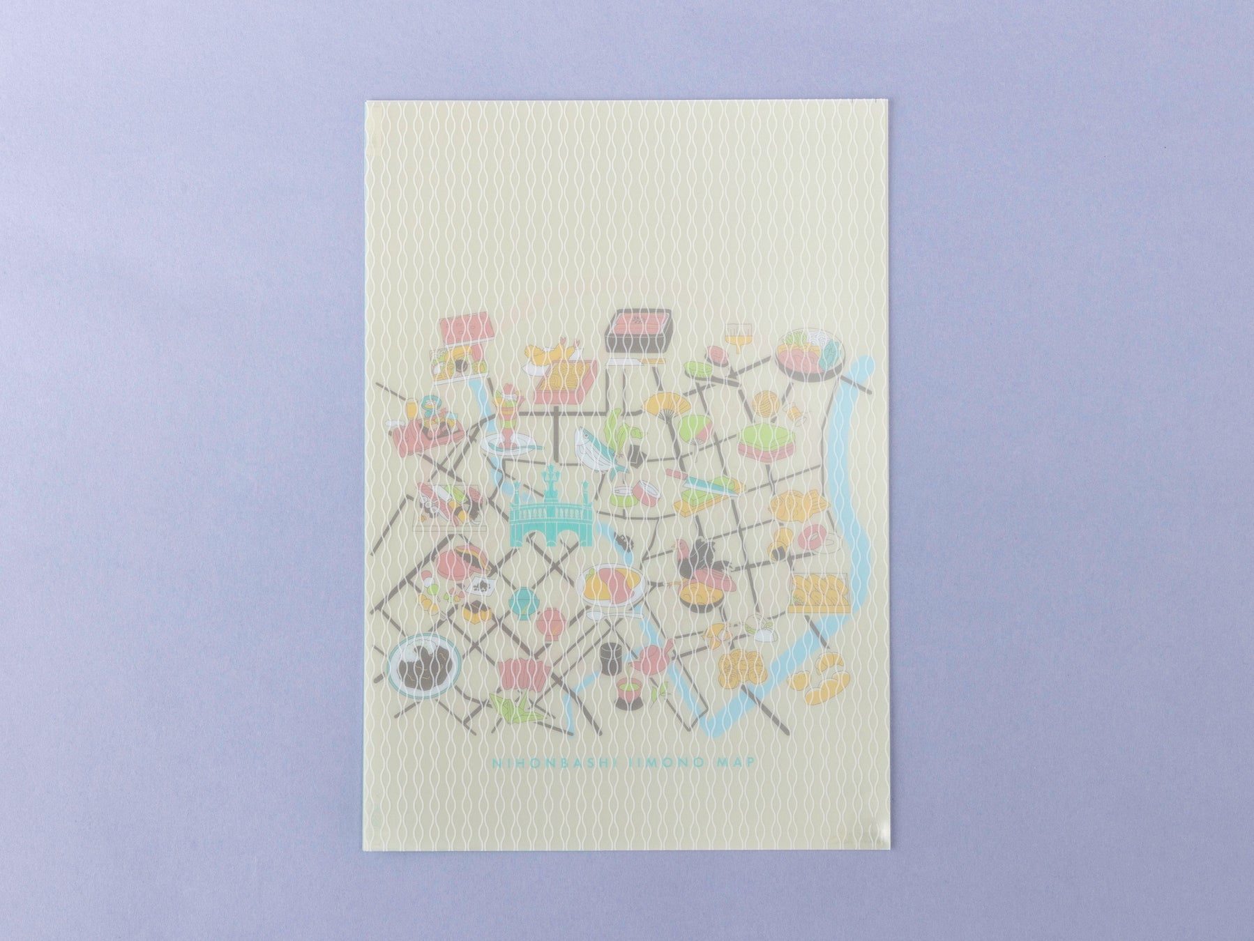 日本橋エリアの地図に、日本橋発祥の味と技をはじめとする “いいもの”をあしらった、A5サイズのクリアファイル。裏面には五街道の起点である日本国道路元標もデザインされています。中仕切り付きで、チケットやパンフレットを入れるのにも便利です。