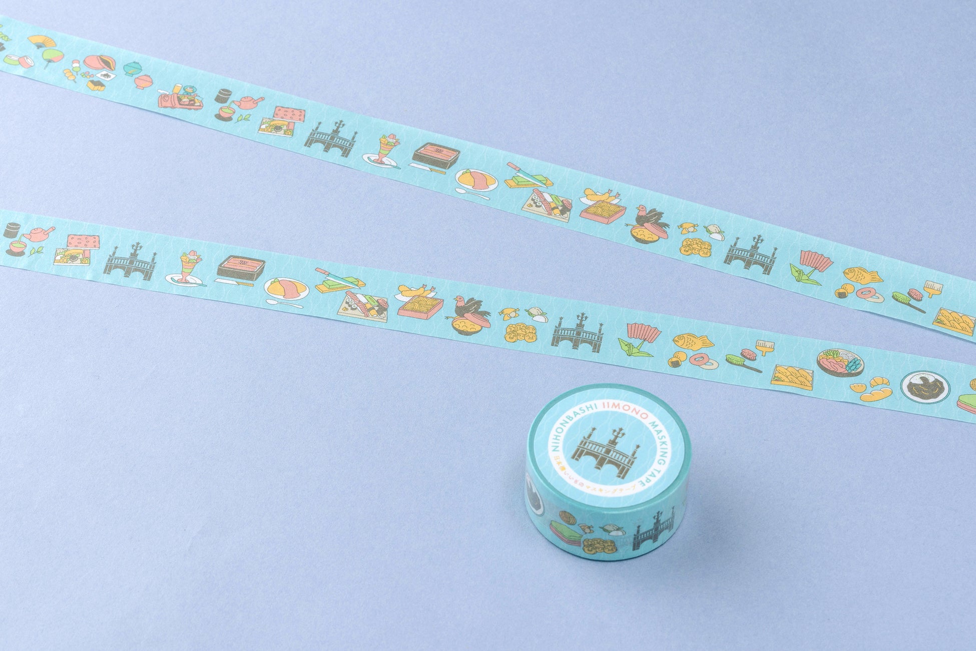 日本橋発祥の味と技をはじめとする “いいもの”を、カラフルな色合いで表現したマスキングテープ。背景には雲や蒸気が立ち昇る様が運気をあげるといわれる江戸小紋「立涌」をあしらい、日本橋川の水面を表現しています。