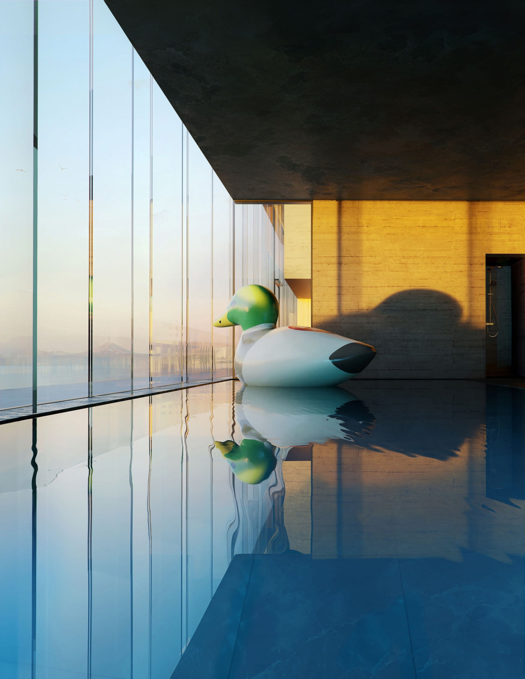ニューヨークの革新的なOJASのスピーカーを備えたリスニングルームも設置されています。プールには、NIGO氏のブランドHUMAN MADEのアイコンである巨大なアヒルが浮かびます。オーナーのゲストは、複数のベッドルームやNIGO氏自身の別荘と同じ仕様のスリーピングポッドに滞在できます。さらに、サウナ、ジム、木製の日本風呂も完備しているほか、NIGO氏の日本の陶芸界への深い関わりにインスパイアされ、茶道のための本格的な茶室も用意されています。