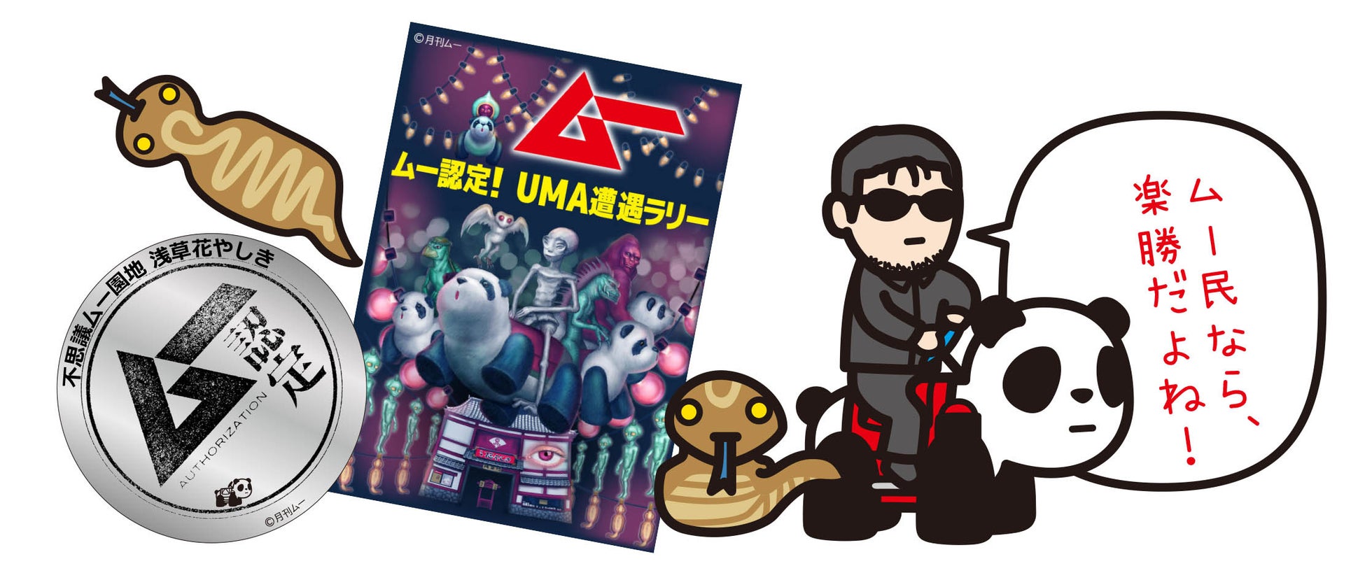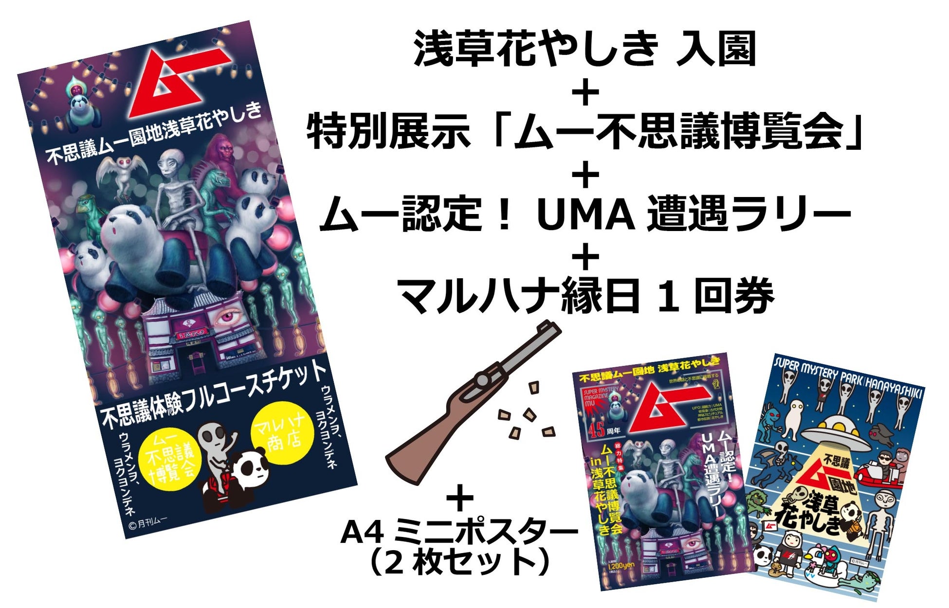 ・内容…入園+特別展示「ムー不思議博覧会 in 浅草花やしき」チケット+ムー認定!UMA遭遇ラリー+グッズ(キービジュアルA4ミニポスター2種)+マルハナ縁日まとあて1回券