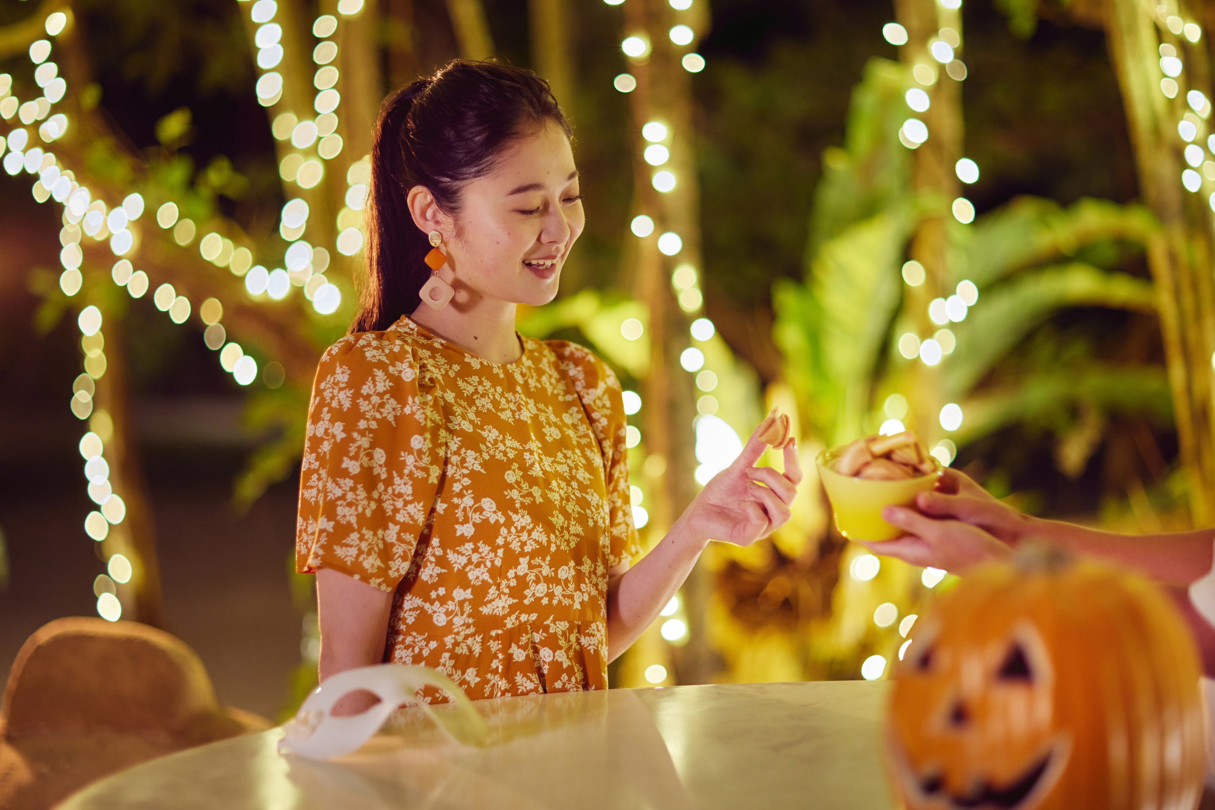 リゾートドレスやかりゆしウェア、貝殻で飾られたマスカレードマスクなど、南の島らしい衣装で仮装し、ハロウィンに参加します。幸運の木として知られるガジュマルの木の下で、南の島らしい衣装を身に纏い、「トリックオアトリート」とスタッフに合言葉を唱えると、フォーチュンクッキーをプレゼント。フォーチュンクッキーには、ハロウィンにちなんだメッセージが書かれており、子どもから大人まで楽しむことができます。