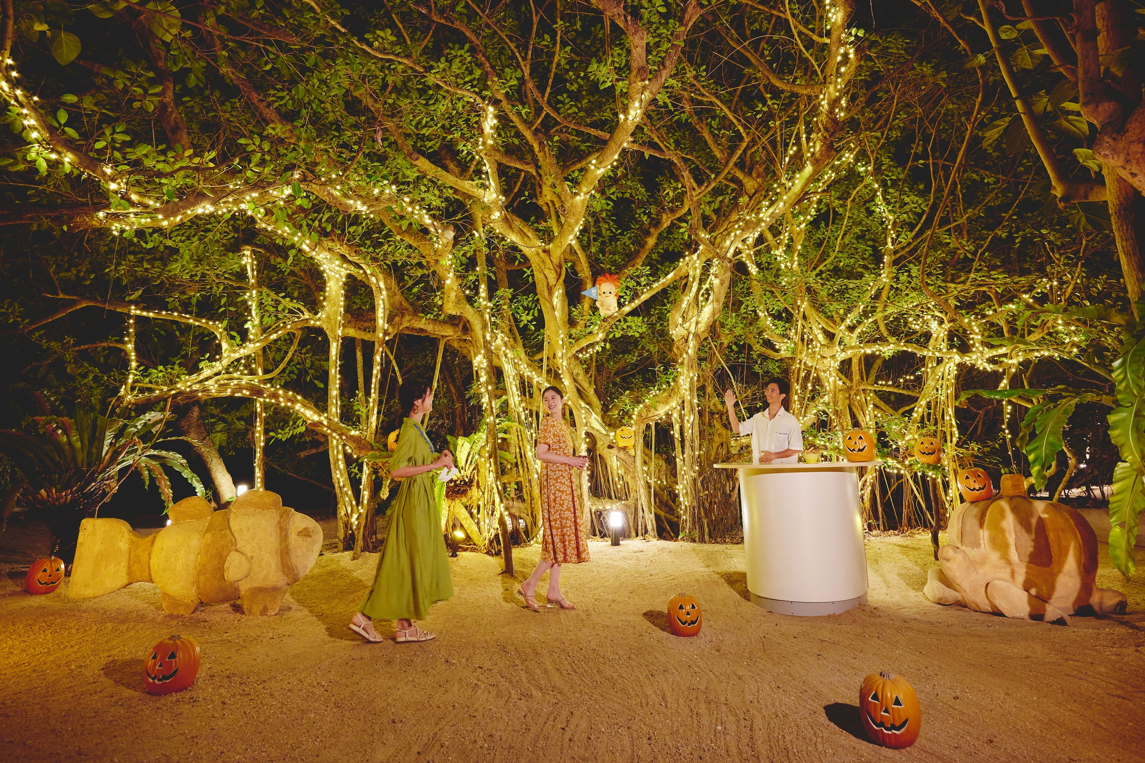 リゾナーレ小浜島のガジュマルの木には、恥ずかしがり屋のキジムナー(*1)が暮らしています。キジムナーは、海の生き物たちと共に、ガジュマル広場でハロウィンイベントを開催することにしました。会場にはたくさんの人々が集まり、大盛り上がり。ところが、肝心のキジムナーは恥ずかしがり屋のため、人々の前に、なかなか姿を現わそうとしないのです。代わって、リゾナーレ小浜島のスタッフが、イベント参加者をおもてなしすることになりました。