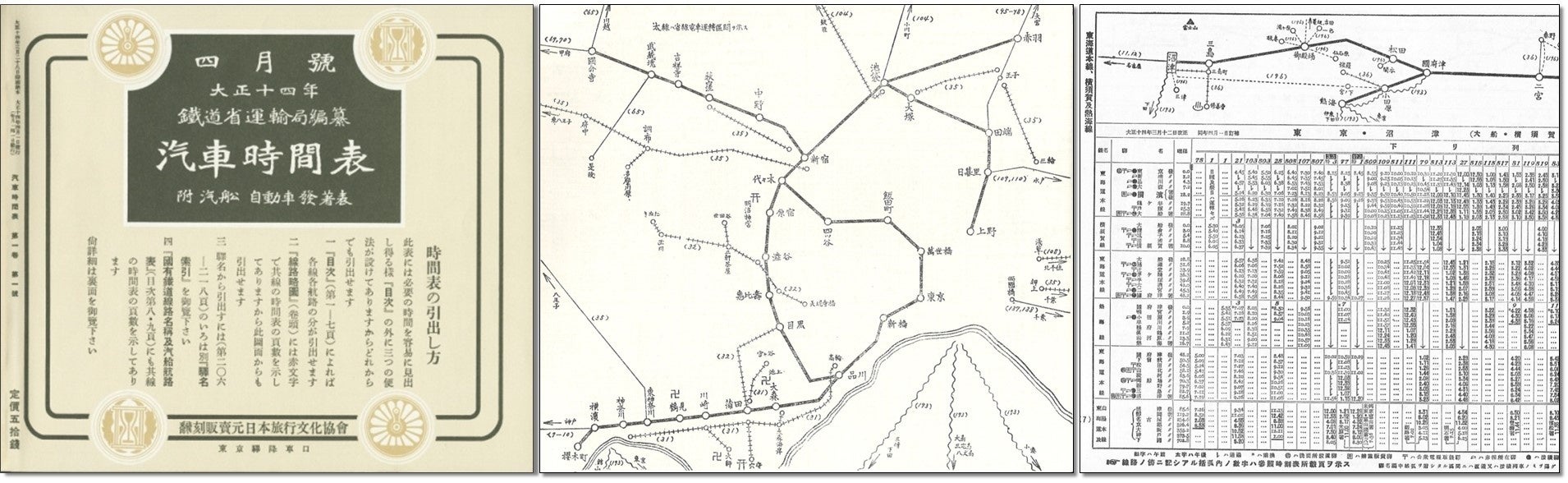 1925年(大正14)4月、まだ東京の山手線が環状ではなかった頃、駅の待合室などに常備されていた鉄道省の業務用時刻表を一般向けに販売したのが鉄道省運輸局編纂の『汽車時間表』でした。この時刻表が、今なお続く『JTB時刻表』の創刊号です。今やお馴染みの算用数字で時刻が連なるフォーマットはこの創刊号から採用されました(それ以前は漢数字)。弁当販売駅や赤帽所在駅を記号で表示するなど、当時としては画期的な誌面でした。