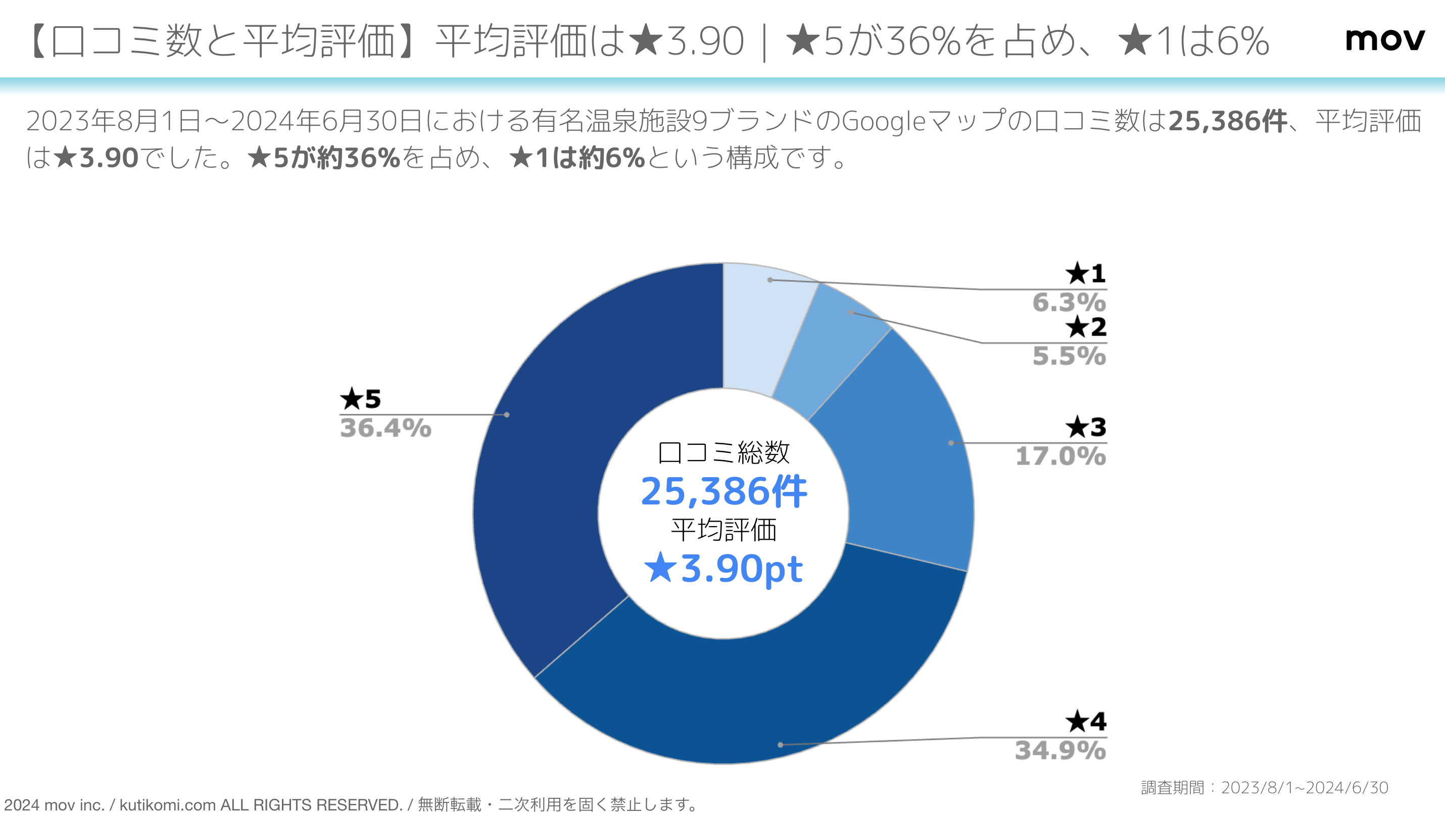2023年8月1日〜2024年6月30日における有名温泉施設9ブランドのGoogleマップの口コミ数は25,386件、平均評価は★3.90でした。