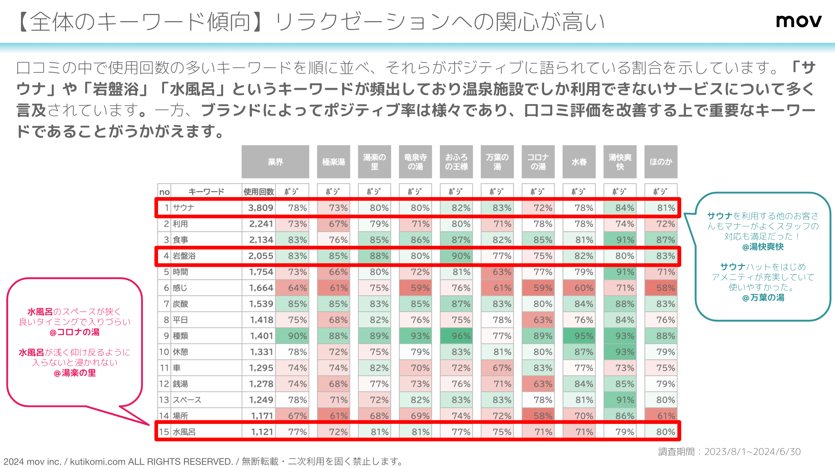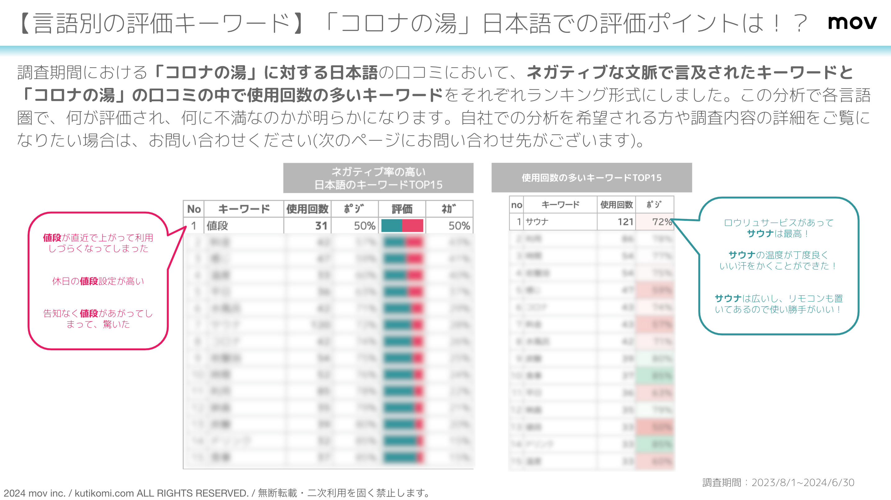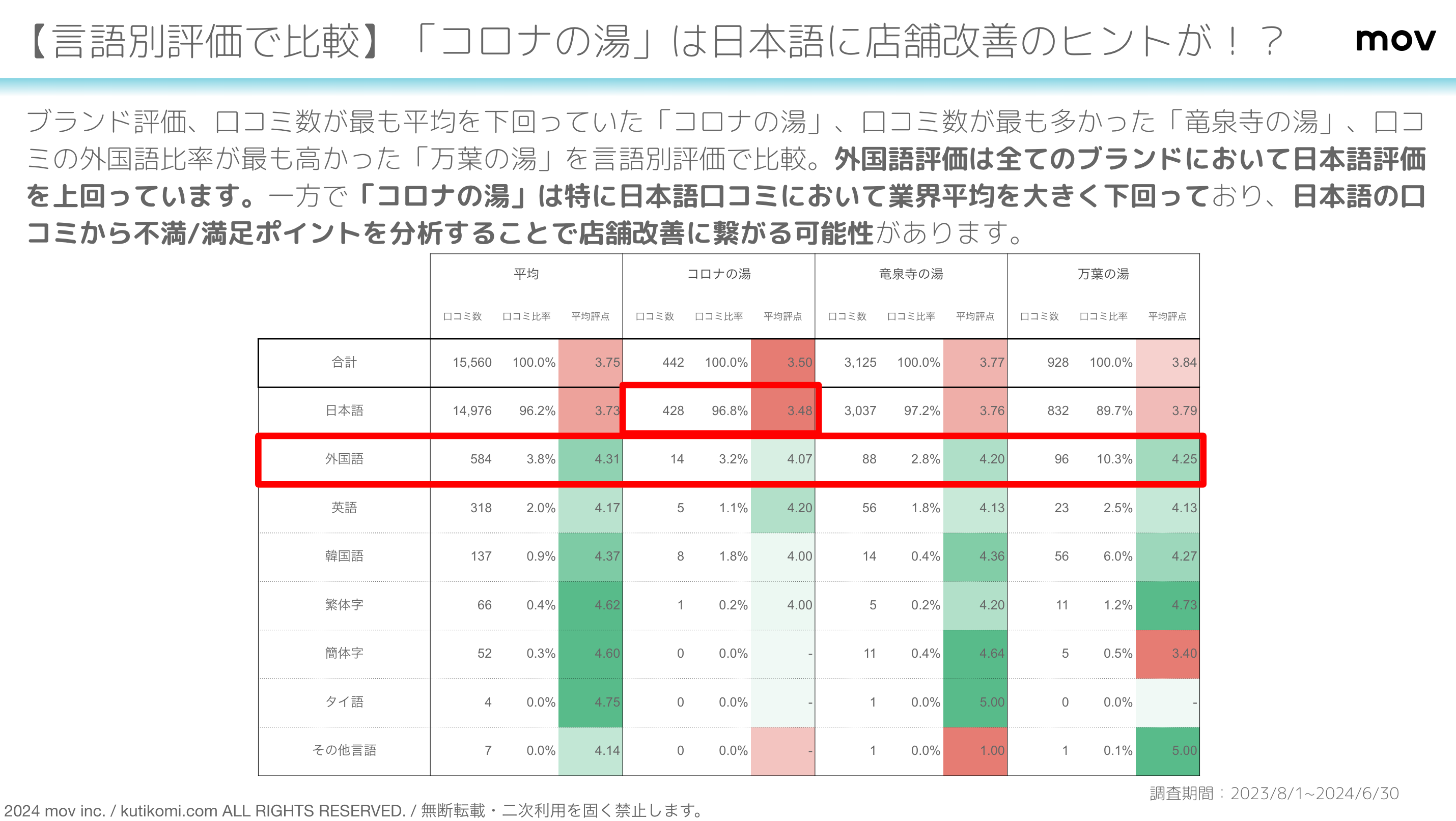 一方で「コロナの湯」は特に日本語口コミにおいて業界平均を大きく下回っており、日本語の口コミから不満/満足ポイントを分析することで店舗改善に繋がる可能性があります。