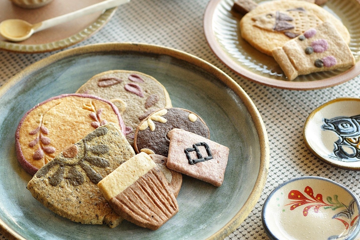 イベント開催中のカフェでは、伝統の酒器や古典柄を模した「やちむんクッキー」と、器を焚き上げる伝統の登り窯をモチーフにした「のぼり窯コロネ」を販売します。やちむんクッキーには「イッチン」「線彫り」など器作りの技法を施すほか、フーチバー(ヨモギ)や紅芋など植物由来の色でやちむんの鮮やかな絵付けを表現しています。サクサクのパイ生地をのぼり窯に見立てたコロネは、幾つもの工房が共同で窯焚きをする、沖縄ならではの焼き窯をお菓子で表現。一つの窯から個性豊かな器が創り出されるように、数種のクリームを一つのコロネに詰めて色々な味わいが楽しめます。