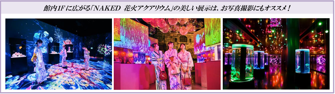 入場券に付属する「まつりチケット」で、各フロアに展開される3つの縁日(輪投げ、手持ち花火、ヨーヨーすくい)が体験できるほか、アトラクション2機種のご利用も可能。また「花火アクアリウム」の各展示もご見学いただけます。涼しげな“青”をまとう生きものたちと大輪のデジタル花火につつまれる没入型エリア「海空花火」や、神秘的なクラゲの展示ゾーンなど館内にはフォトスポットもたくさん!ぜひ浴衣の装いでご参加いただき、写真撮影も存分にお楽しみください。