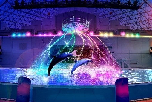 特定日限定で実施するナイトver.では、幻想的な映像、噴水、光の演出で海の神秘的な空間を作りあげます。『アイナ・ジ・エンド』の叙情豊かでロマンチックに織り上げられた楽曲と457インチのビジョンに映し出されるミュージックビデオ、マッピング投影される今を生き抜く人々の物語を紡ぐ歌詞と照明・噴水装置がシンクロし、シロイルカ・バンドウイルカ・カマイルカが魅せる躍動など、圧倒的没入感で感動的なパフォーマンスをお楽しみください。