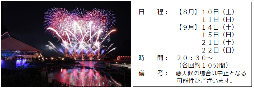 「花火シンフォニア」は、デジタル制御によって花火と音楽がコンマ1秒までシンクロし、10分間で約2,500発もの花火が打ちあがるシーパラオリジナルの花火ショー。
