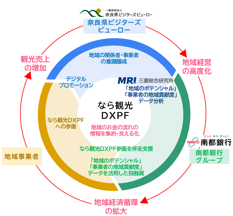 本事業では、奈良県ビジターズビューローが管理・運営する既存システムを「なら観光DXPF」として機能強化することで、地域の観光に関連するサービス・商品の予約、決済、顧客管理、仕入れ、そして投融資までの商流データを、2025年1月末までに集約・見える化します。そして、「地域のポテンシャル」「事業者の地域貢献度」を活用した投融資評価スキームを開発するとともに、地域の観光事業者・DMO・地域金融機関が一体となった新たな産業共同体を構築します。