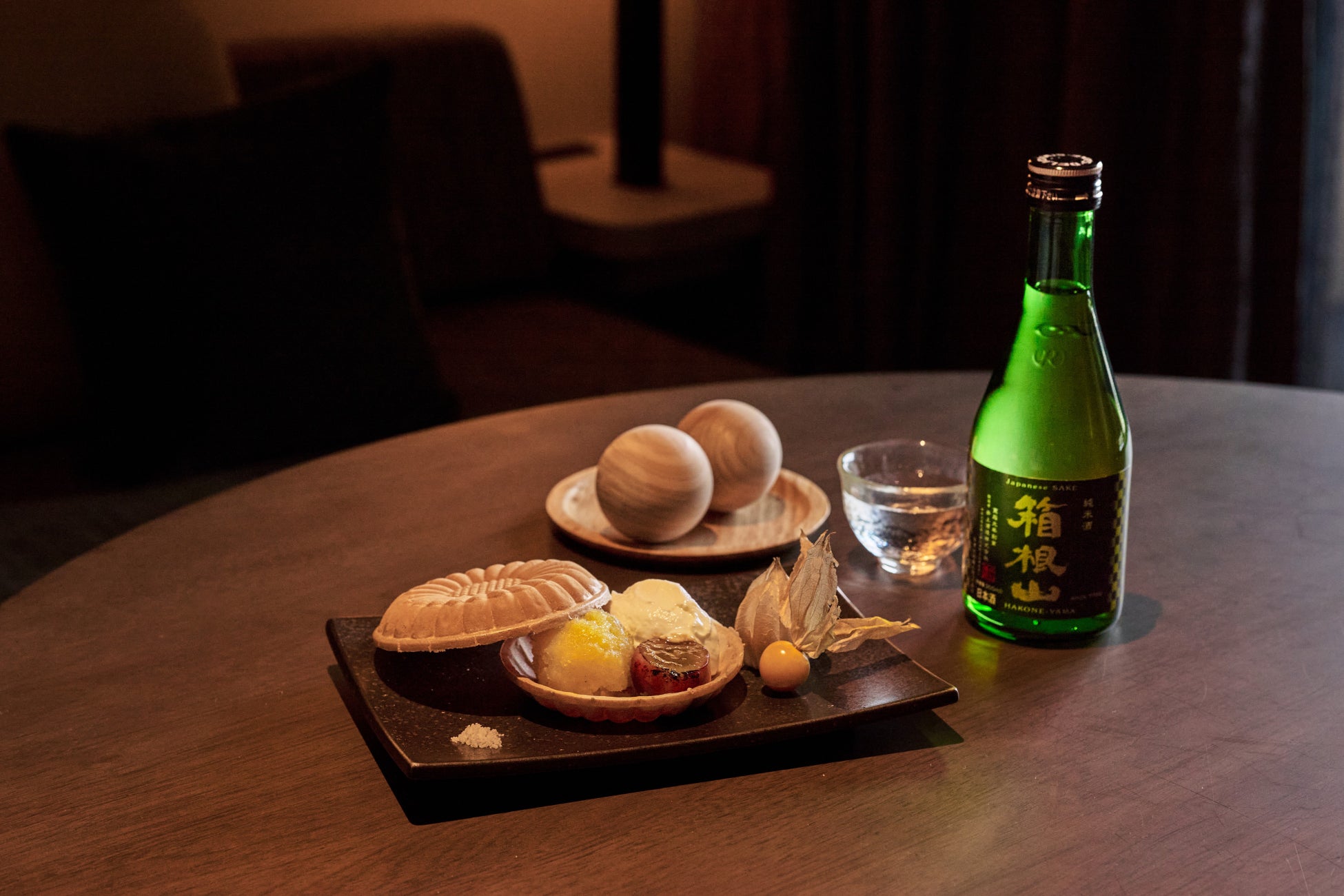 心地よい風が吹き、澄んだ空に月が美しく輝く季節。本プランは秋の夜長に、純米大吟醸の香り高く、さっぱりとした味わいの地酒「箱根山」と、その「箱根山」を使用したアイス最中、客室露天風呂での湯浴みで、月を眺めながらゆったりと寛ぐひとときをお過ごしいただけるディナー付き宿泊プランです。ご夕食は、箱根外輪山の紅葉を望むレストランで、御殿場ベーコンや伊豆鹿のハムなど地元食材に秋の味覚を合わせ、和の趣きに洋のスタイルが融合したディナーコース「秋三昧」をお楽しみいただけます。ご夕食後は、広々とした客室露天風呂で月を眺めながらの湯浴みを堪能、さらに客室露天風呂の温泉をより満喫できるひのきボールもご用意しました。ひのきボールは湯面に浮かべて香りを楽しむ他、マッサージにもお使いいただけます。湯上りには、地酒の「箱根山」と「箱根山」を使用したスイーツでお月見をご堪能ください。