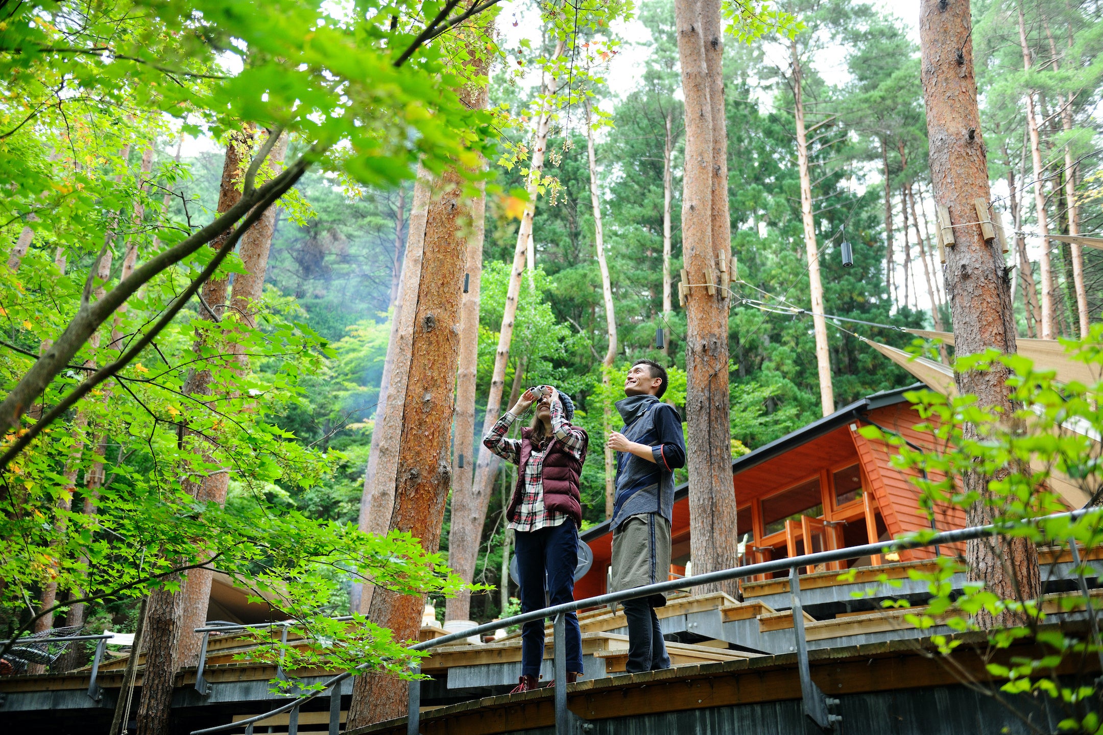 河口湖を望む丘陵に溶け込むように建つ、日本初のグランピングリゾート* 。焚き火を眺めながら過ごすひと時、広大なアカマツの森の中で愉しめる体験型の食事、自然の中で身体を動かす爽快感。常に屋外で快適に過ごせる環境の中、四季を通して新しい価値を提供します。