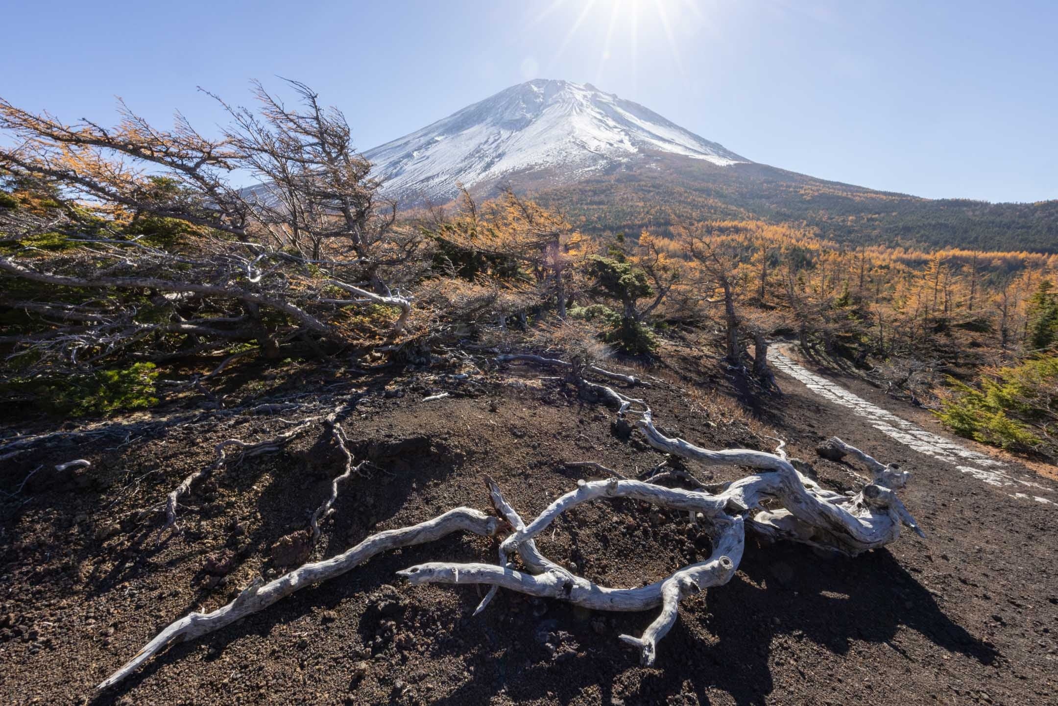 紅葉トレッキングの舞台は、富士山5合目から続く、「お中道(おちゅうどう)」周辺のコースです。富士山5合目は、天と地の境目とされ、その中でもお中道は、富士山信仰が盛んだった時代、富士山に3回登頂した人だけが歩くことが許された特別な道でした。見上げると富士山頂、眼下には雲や富士五湖が広がるロケーションの中で、森林限界の厳しい環境を生きる力強い植物が織りなす、圧巻の美しい紅葉を見ることができます。