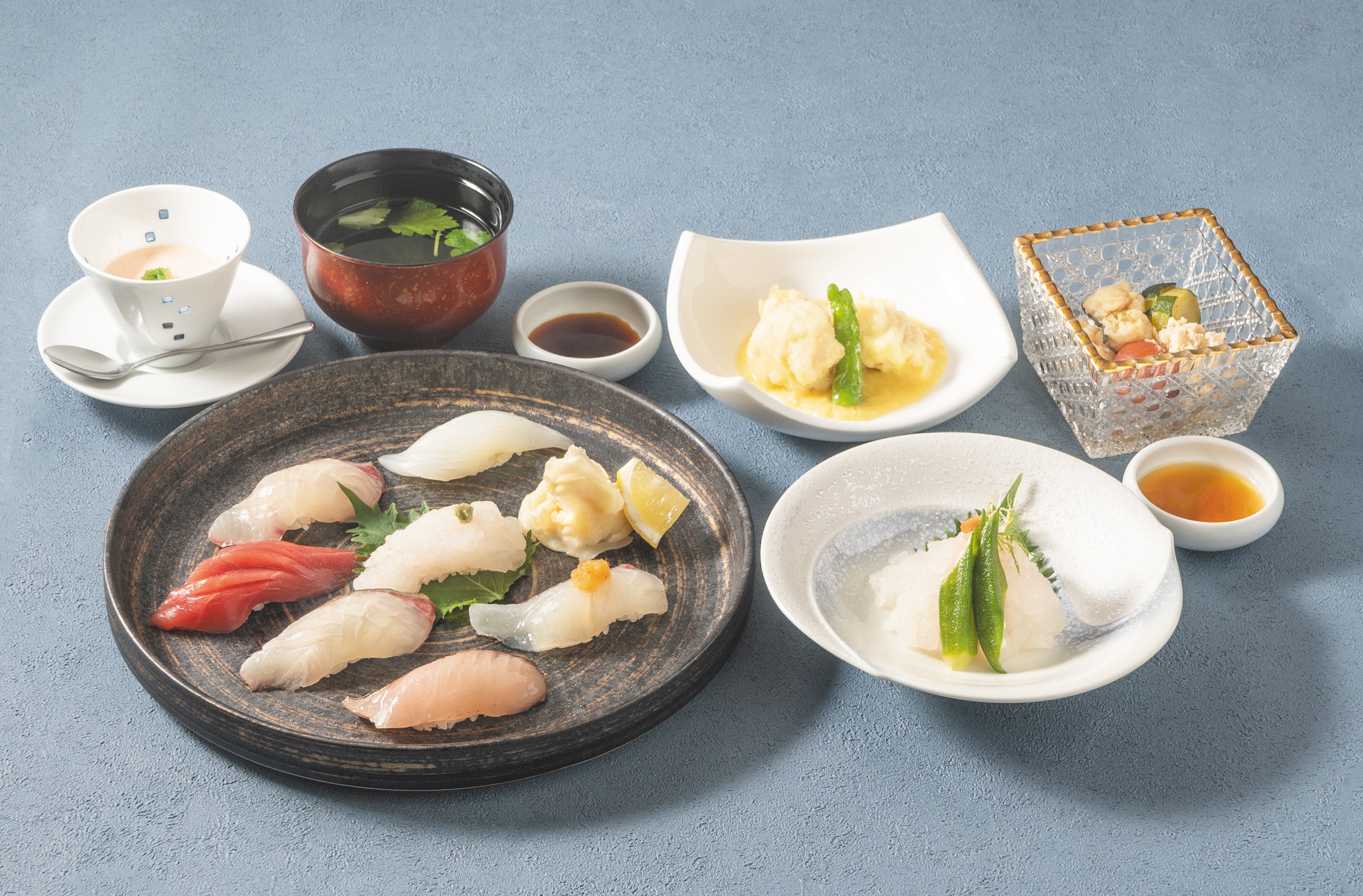 旬彩三種、蓋物、鮨十貫、吸物