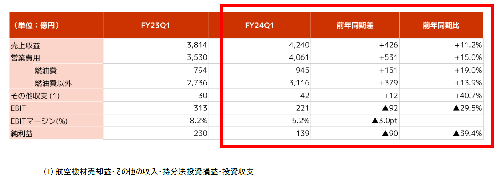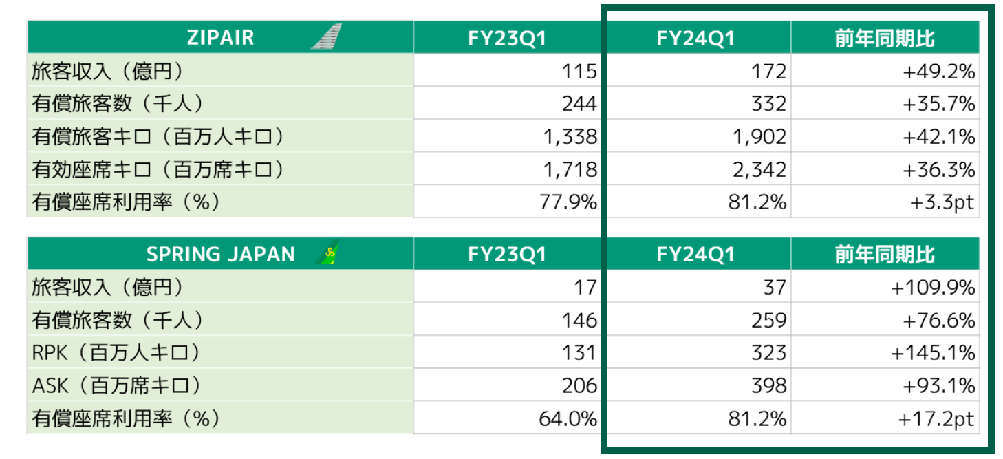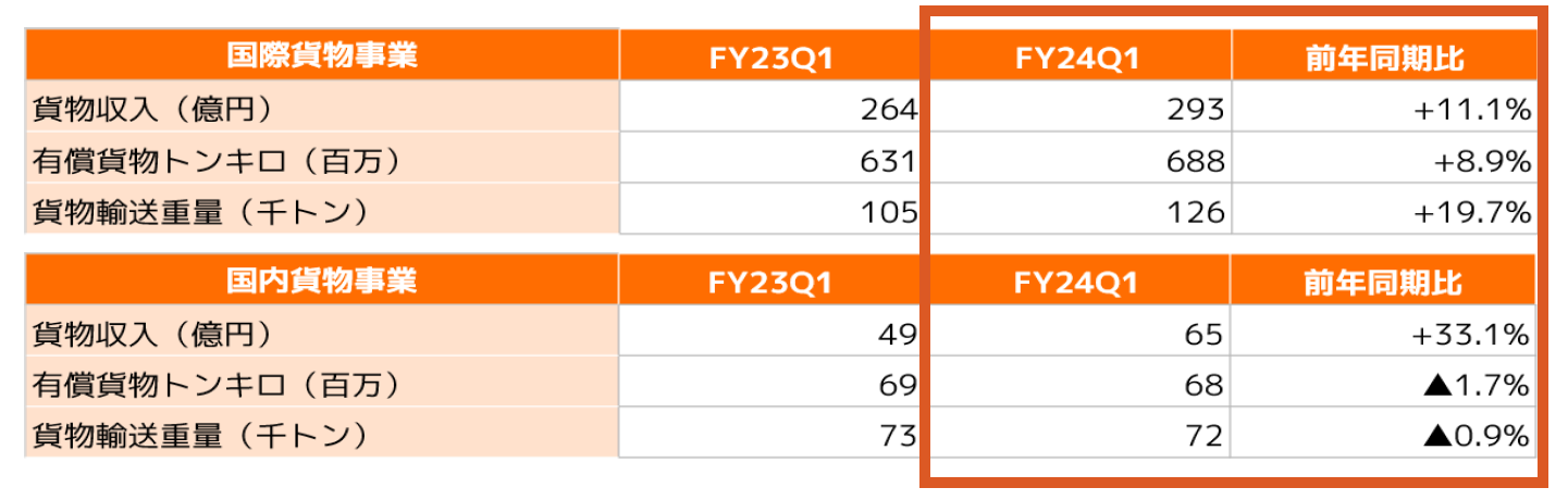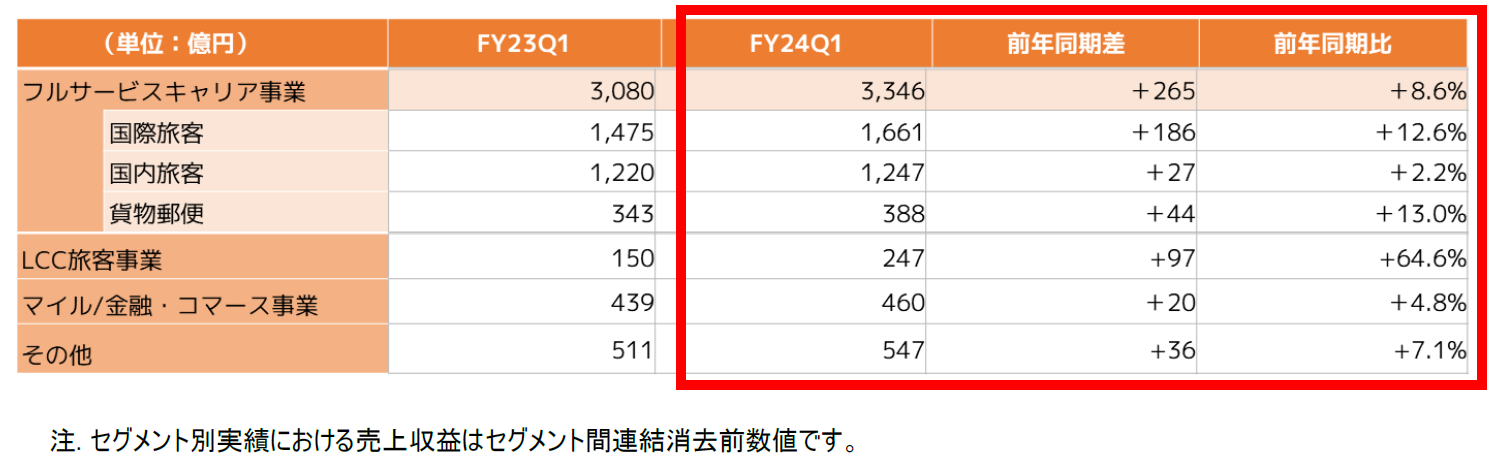 当第1四半期は、フルサービスキャリアおよびLCCの各航空事業、マイル/金融・コマースおよびその他各非航空事業それぞれの収入が前年を上回り、売上収益は前年比+11.2%の4,240億円となりました。国際旅客は、6月の訪日外客数が単月として過去最高となるなど好調なインバウンド需要を取り込み、旅客数はフルサービスキャリアが前年比+11.4%、ZIPAIRは+35.7%となりました。また、国内旅客は団体旅客など一部の客体について旅客数が伸び悩み、旅客数は前年比▲6.6%となったものの、単価が前年比+9.5%と上昇したことで増収となりました。貨物郵便についても2月から運航を開始した貨物専用機の導入により国際貨物輸送重量が前年比+19.7%と増加しました。マイル/金融・コマース事業については、発行マイル数の増加により前年比+4.8%の増収となり、旅行・受託等のその他事業については前年比+7.1%の増収となりました。