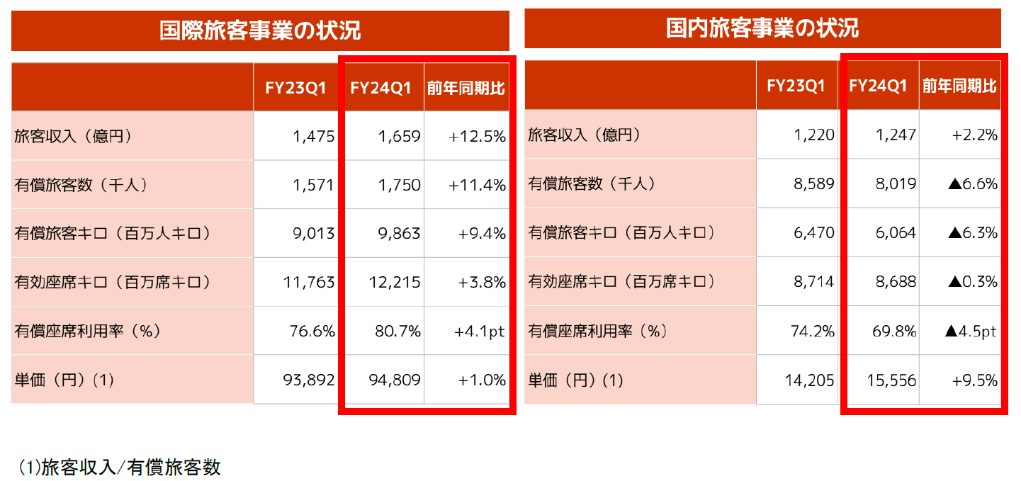 有償旅客数は前年比+11.4%、旅客収入は前年比+12.5%となりました。単価は、今期も前年比+1.0%と今期も前年同期並みの高水準を維持しており、今後も回復傾向にある日本発業務需要を取り込み、高水準を維持する見込みです。