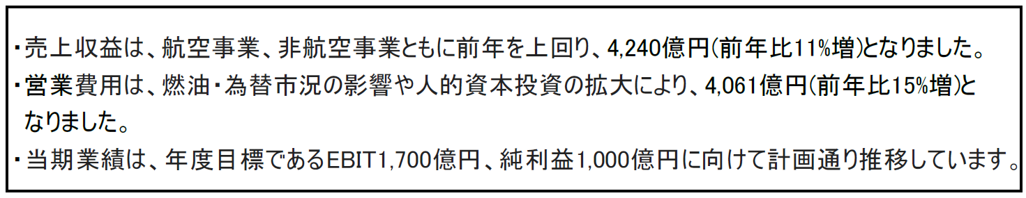 費用については、さらなる円安による燃油費増や安定的な人財確保に向けた人的資本投資による人件費の増加やその他各種費用を含む営業費用が15.0%増加した結果、EBITは221億円(前年比 ▲29.5%)、純利益は139億円(前年比約▲39.4%)となりました。